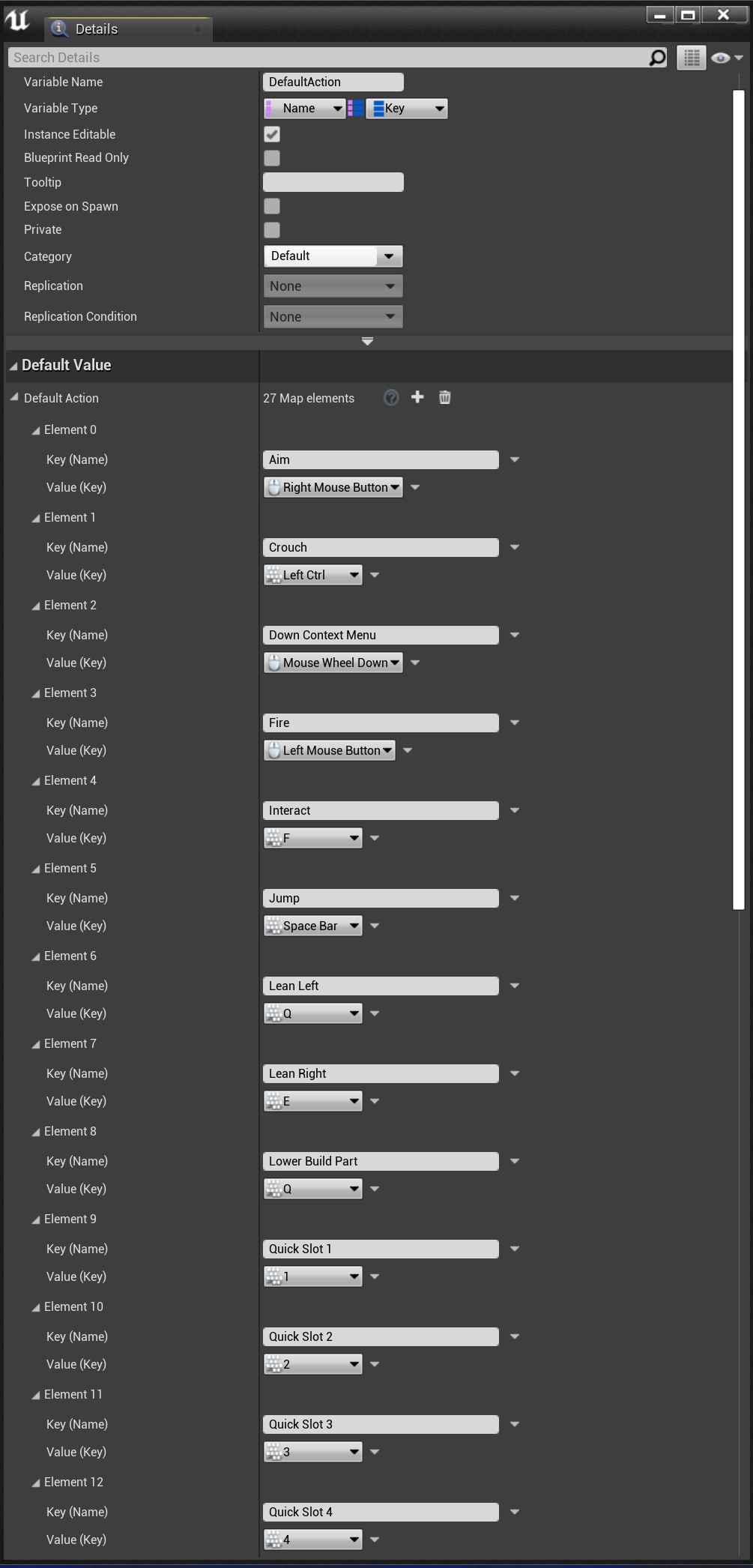 Next select the DefaultAxis variable and in the details set the Defaults Values shown in the image below. To add new entrys to the defaults values click the + button. The Key (Name) variables must be identical to the image below.