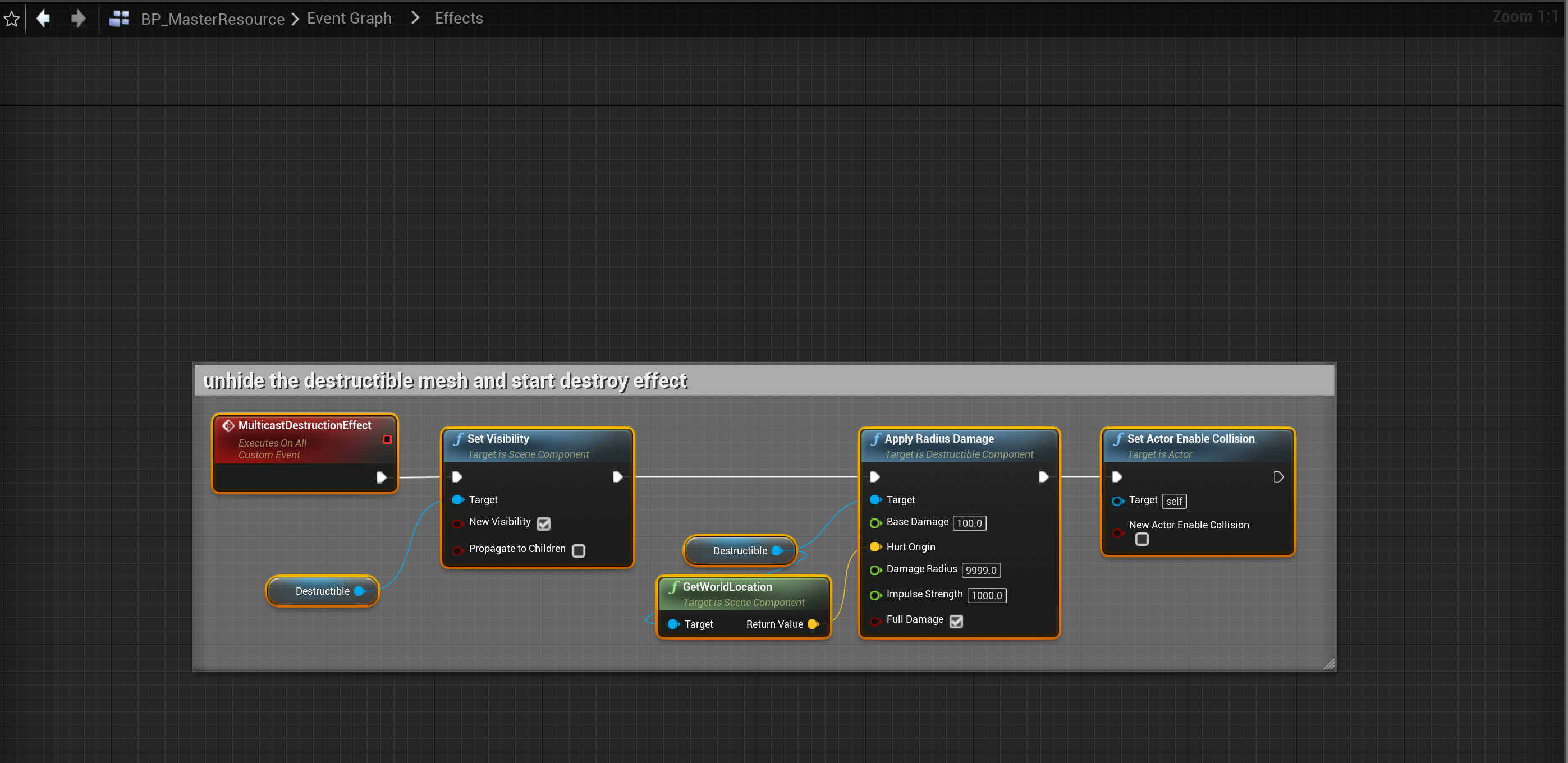 Next go to the Effects collapsed node in the BP_MasterResource and create a new custom event and call it MulticastDestructionEffect then set its replicates to Multicast and tick on Reliable. Then copy the image below.