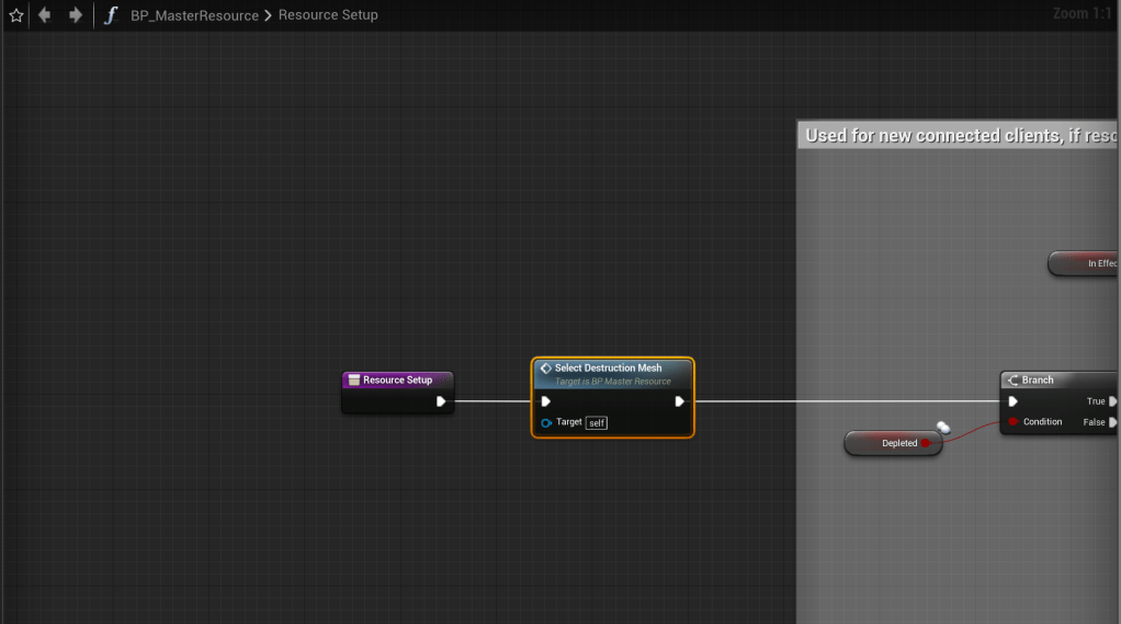 Next go to the Effects collapsed node in the BP_MasterResource and create a new custom event and call it MulticastResetDestructionEffect then set its replicates to Multicast and tick on Reliable. Then copy the image below.