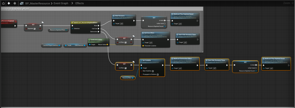 Next go to the Effects collapsed node in the BP_MasterResource and create a new custom event and call it MulticastHideDestructionEffect then set its replicates to Multicast and tick on Reliable. Then copy the image below.