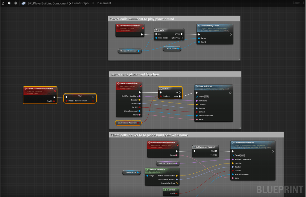 Create a new variable in the BP_PlayerBuildingComponent called DisableBuildPlacement and set its type to Boolean then copy the image below. You will need to create the ServerDisableBuildPlacement event set it to RunOnServer and tick Reliable and add a new Boolean input and call it Disable.
