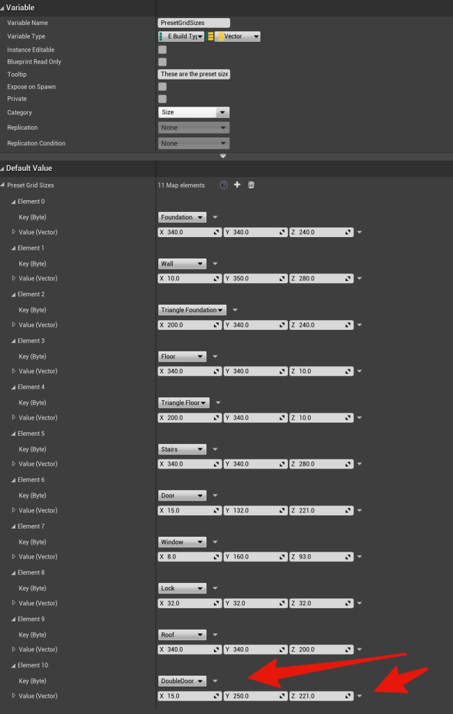 Next go to the BP_GridComponent and select the PresetGridSizes variable and add the setting shown in the image below, to add a new entry click the small + button.