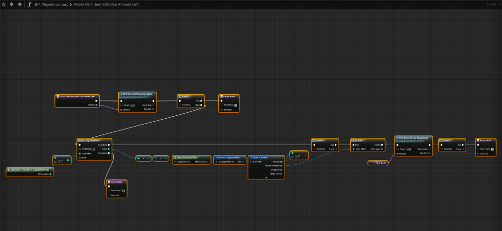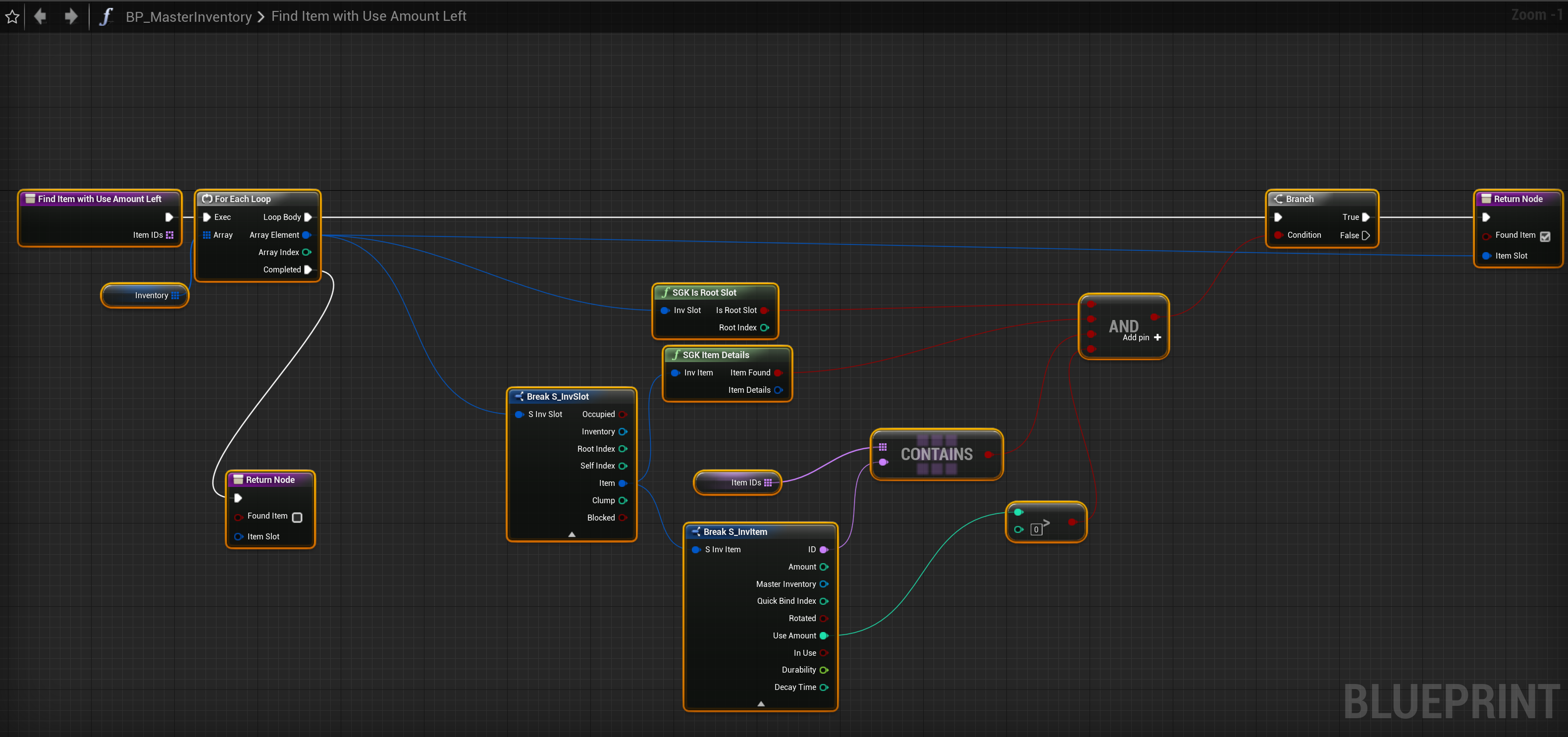 Go to the BP_MasterInventory and create a new function called FindItemWithUseAmountLeft and add a new input called ItemIDs and set the type to Name and set it to an array. Then add a new output called ItemFound and set it to Boolean. Then add another output call it ItemSlot and set its type to S_InvSlot. Then copy the image below.