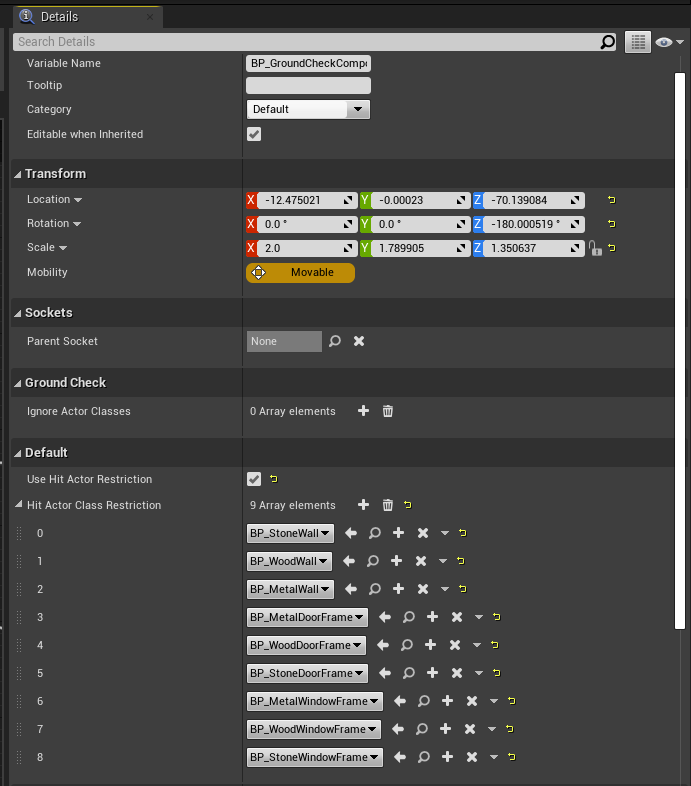 This allows you to set a ground check component to require hitting a spacific actor to allow placement. For example you could use this setting on the BP_Lamp ground check component’s settings to only allow it to place on wood and stone walls, window frames and door frames.