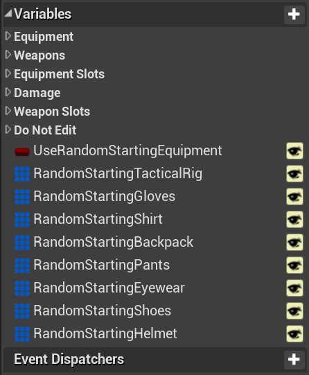 Go to the BP_EquipmentInventory and create a new variable called UseRandomStartingEquipment and set it to Boolean and tick on Instance Editable.