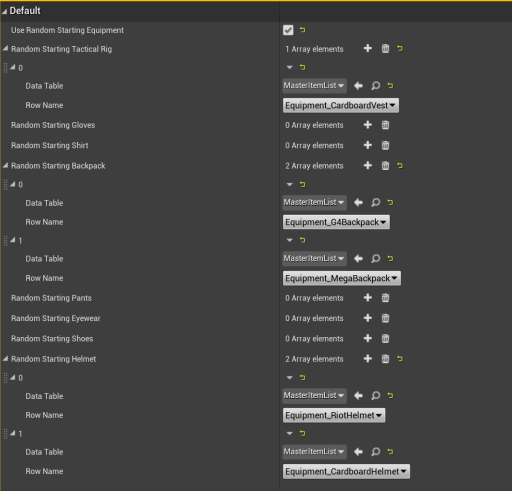 You can now set random equipment items in the BP_PlayerInventory Class Defaults like shown in the image below, remember to tick on Use Random Starting Equipment.