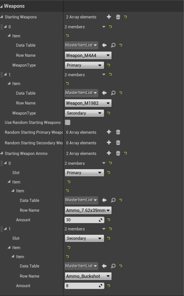 Go to the Blueprints/Other/Structs folder and create a new Struct called S_StartingAmmo then add variables shown in the image below.