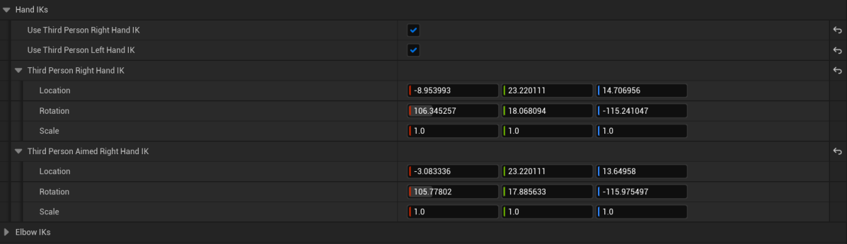 When Third Person Right Hand IK is enabled the right hand will attempt to set its location to either the Third Person Right Hand IK or the Third Person Aimed Right Hand IK if in the Aiming stance.