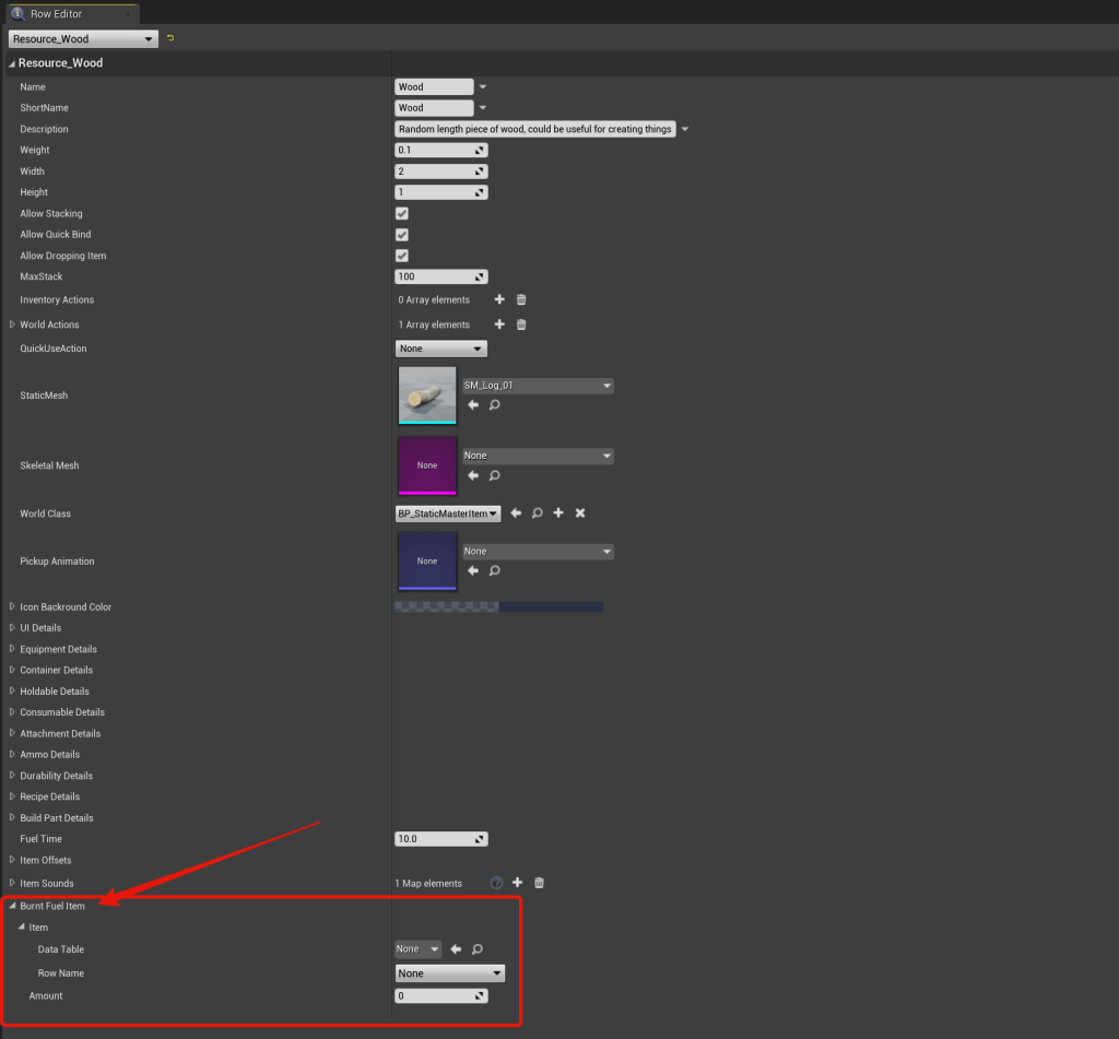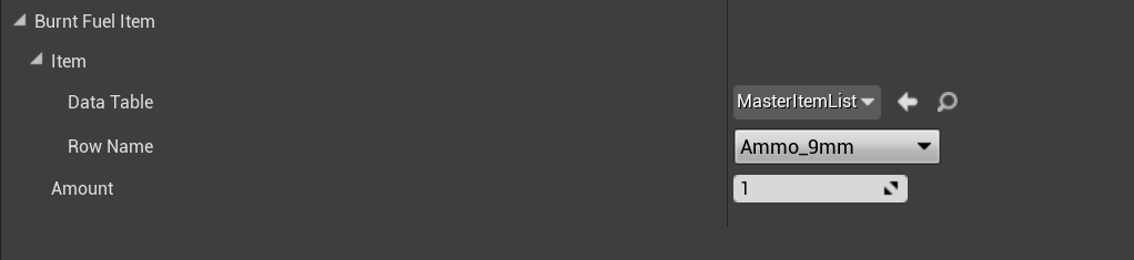 Here you set the Data Table to the MasterItemList and then you will be able to select an item in the Row Name drop down, then you set the amount you want to receive when the item is used as fuel. Like the image below.