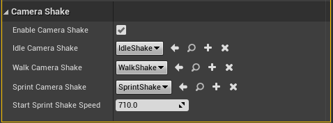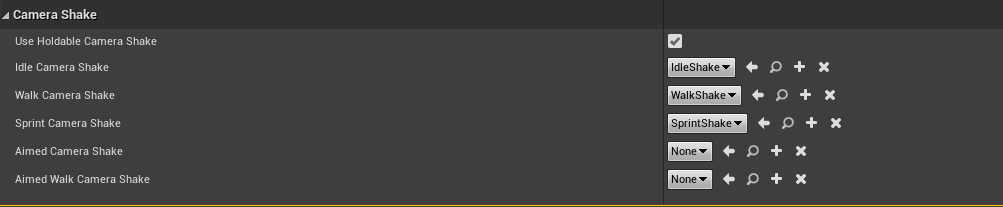You can also disable or set different camera shake settings for when a weapon is held. To do this go to the weapons holdable blueprint and in its Class Defaults you can search for Camera Shake and change the weapons camera shake blueprints for the different character states.