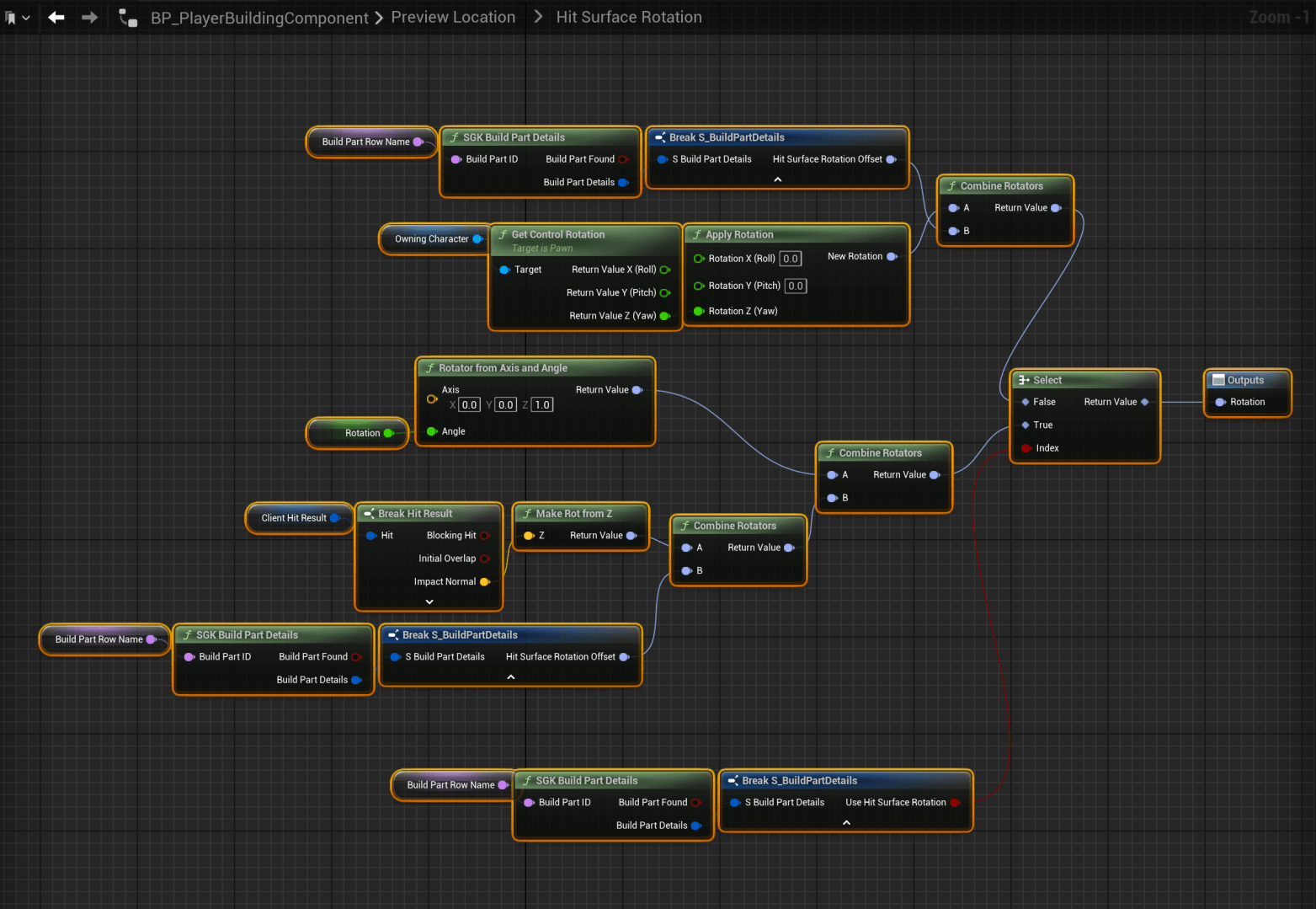 Go to the BP_PlayerBuildingComponent, then open the PreviewLocation function, then open the HitSurfaceRotation collapsed node, delete the code in it and add the nodes shown in the image below.