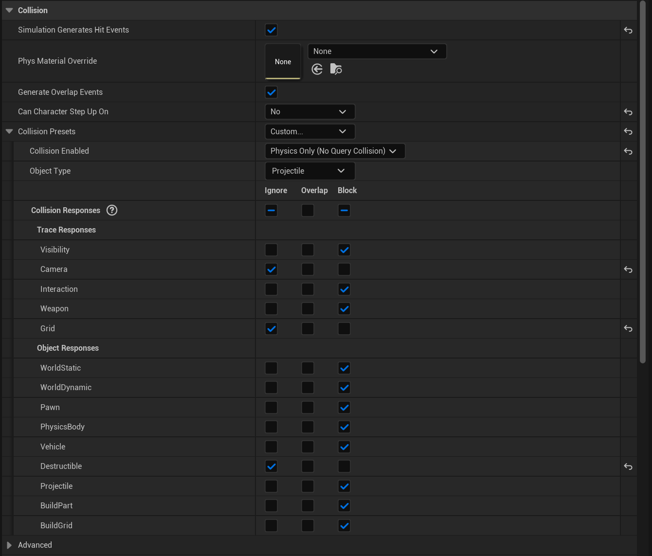 Then select the ProjectileMesh component in the Components panel and copy the collision settings shown below.