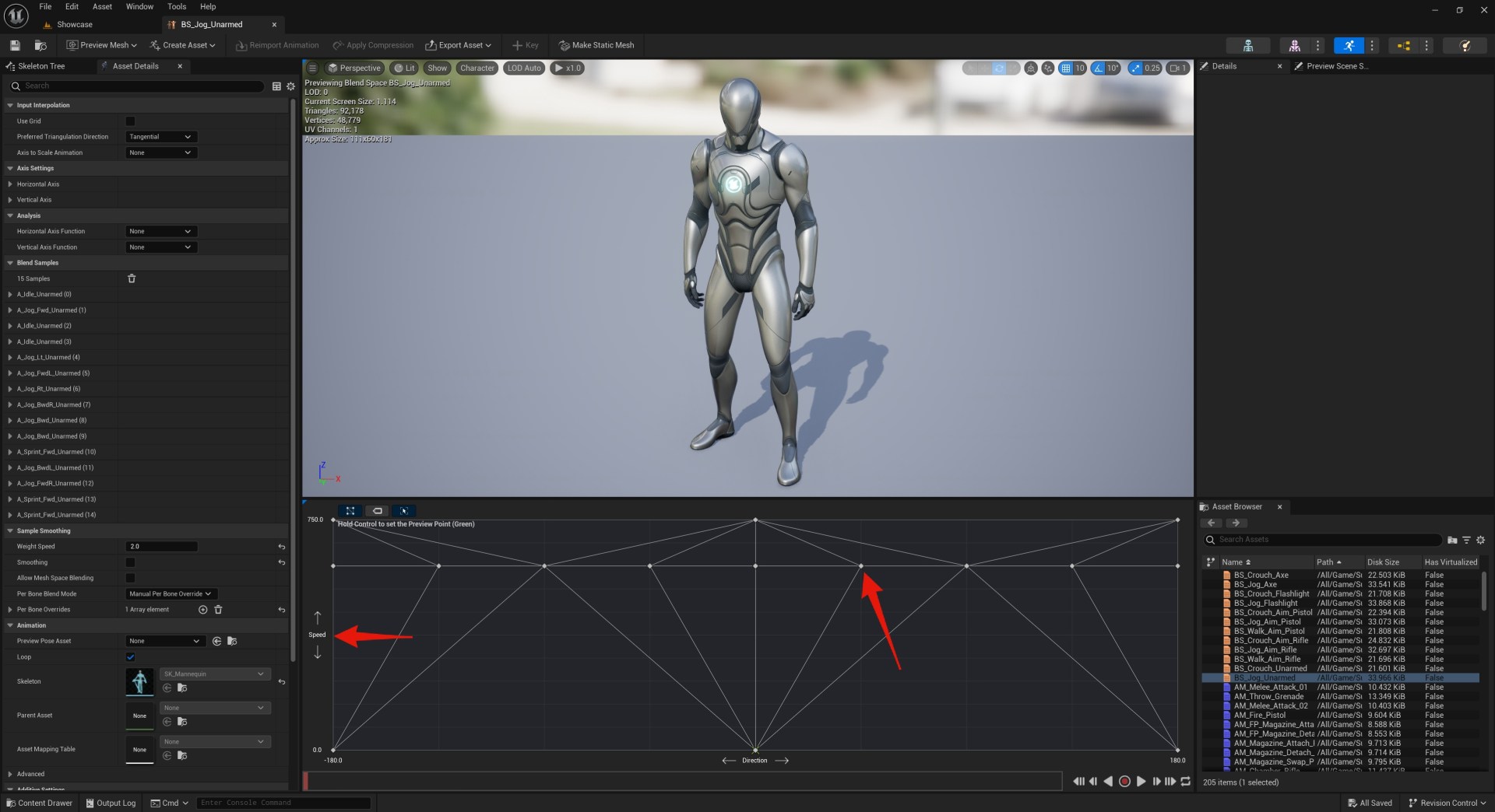 To change the animations used by a blend space you can right click the dots on the graph like the image below shows, this will allow you to change the animation and speed at which that animation is fully played on the character.