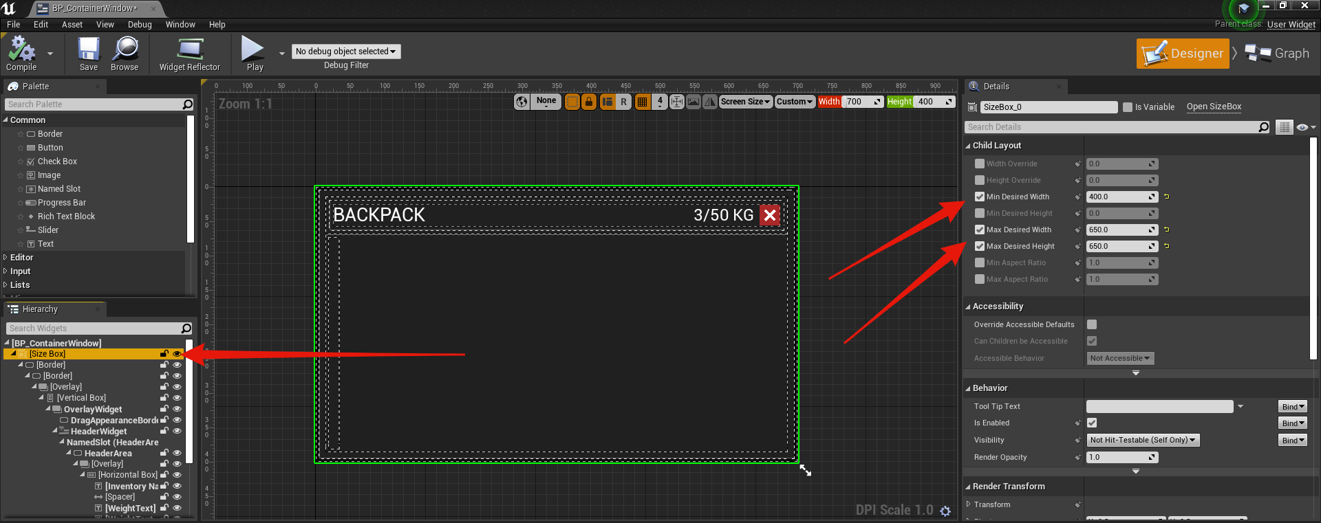 Go to the BP_ContainerWindow widget and then in the Designer view select the size box, then in the details panel you can set the windows max and min size.