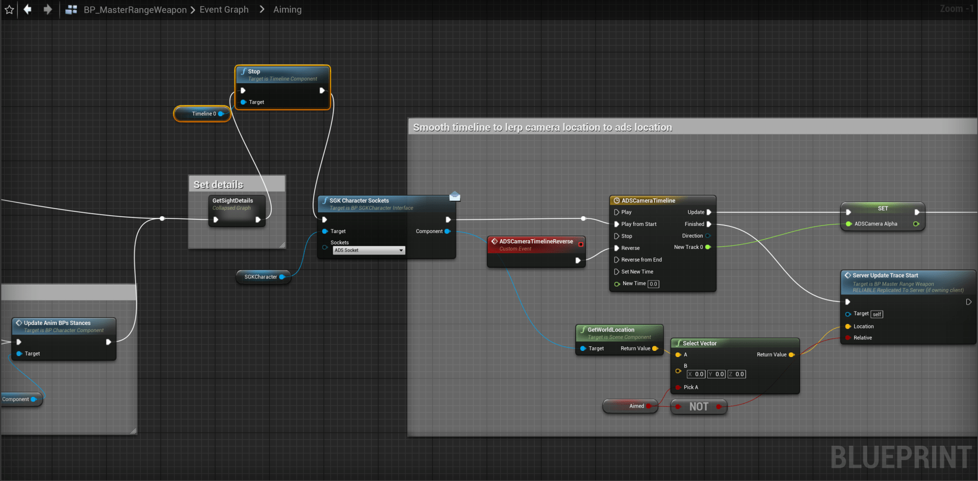Open the BP_MasterRangeWeapon then open the Aiming collapsed node and add the highlighted nodes shown in the image below.