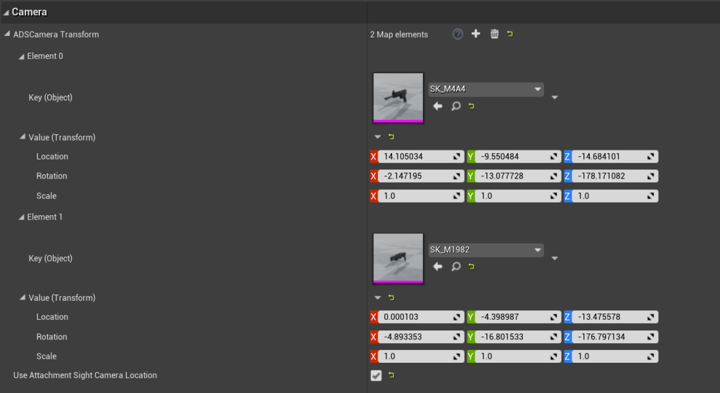 Next go to the BP_M4A4ReddotAttach then to its class defaults and in the ADS Camera Transform set the Value (Transform) like the image below.