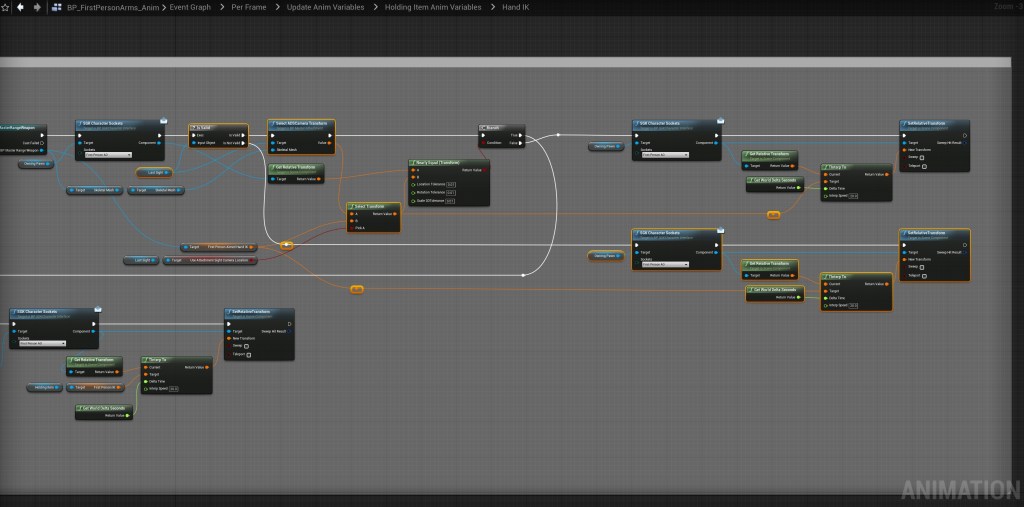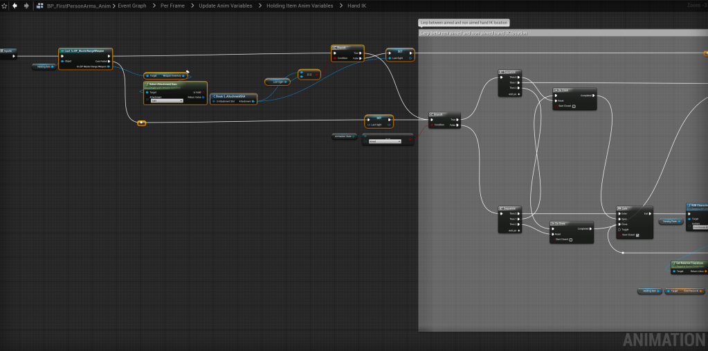 Next go to the BP_FirstPersonArms_Anim and create a new variable called Last Sight, set its variable type to BP_MasterAttachment. Then copy the images below adding the highlighted nodes.