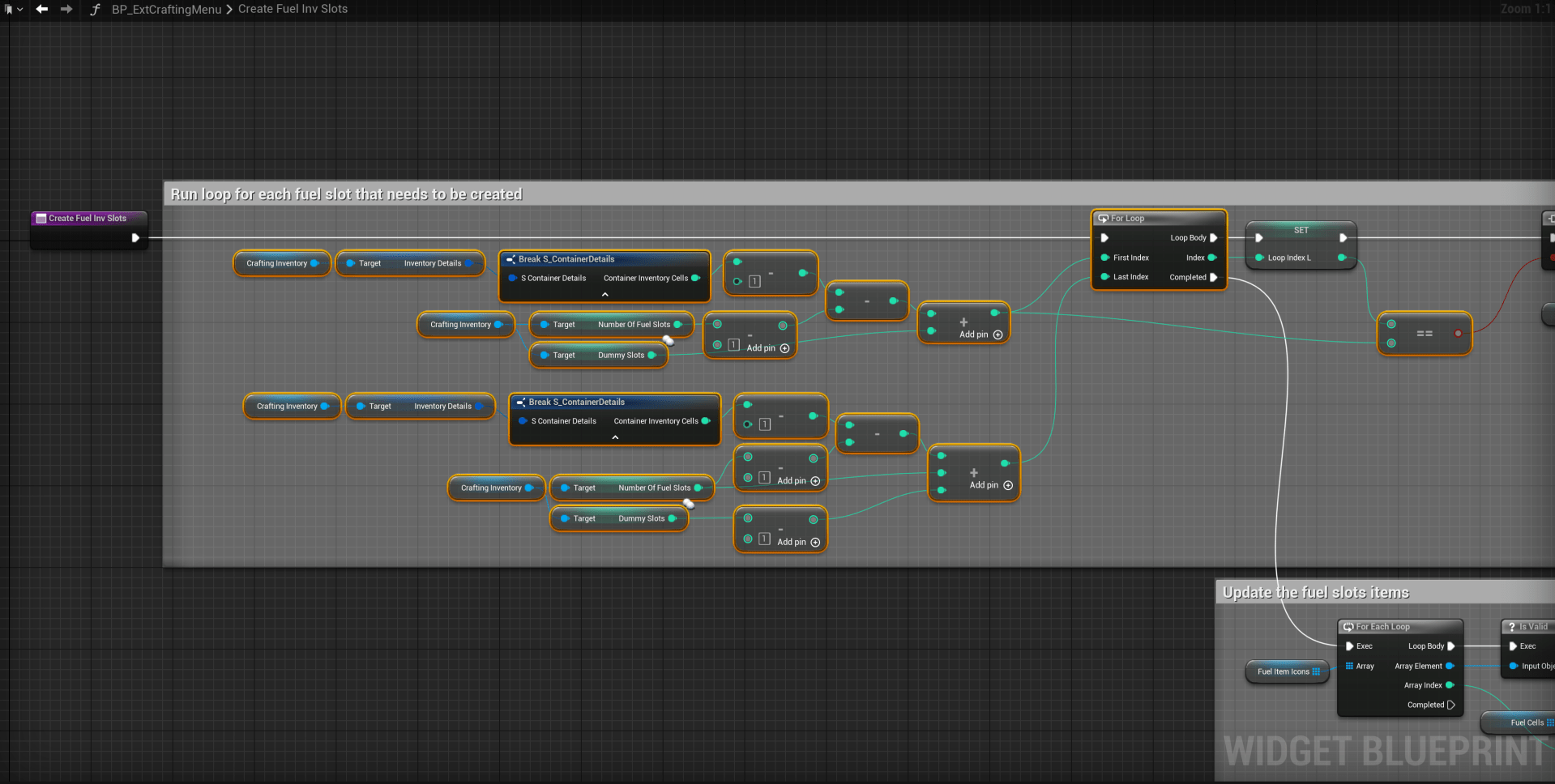 Open the BP_ExtCraftingMenu then go to the Graph mode and open the CreateFuelInvSlots function and copy the image below.