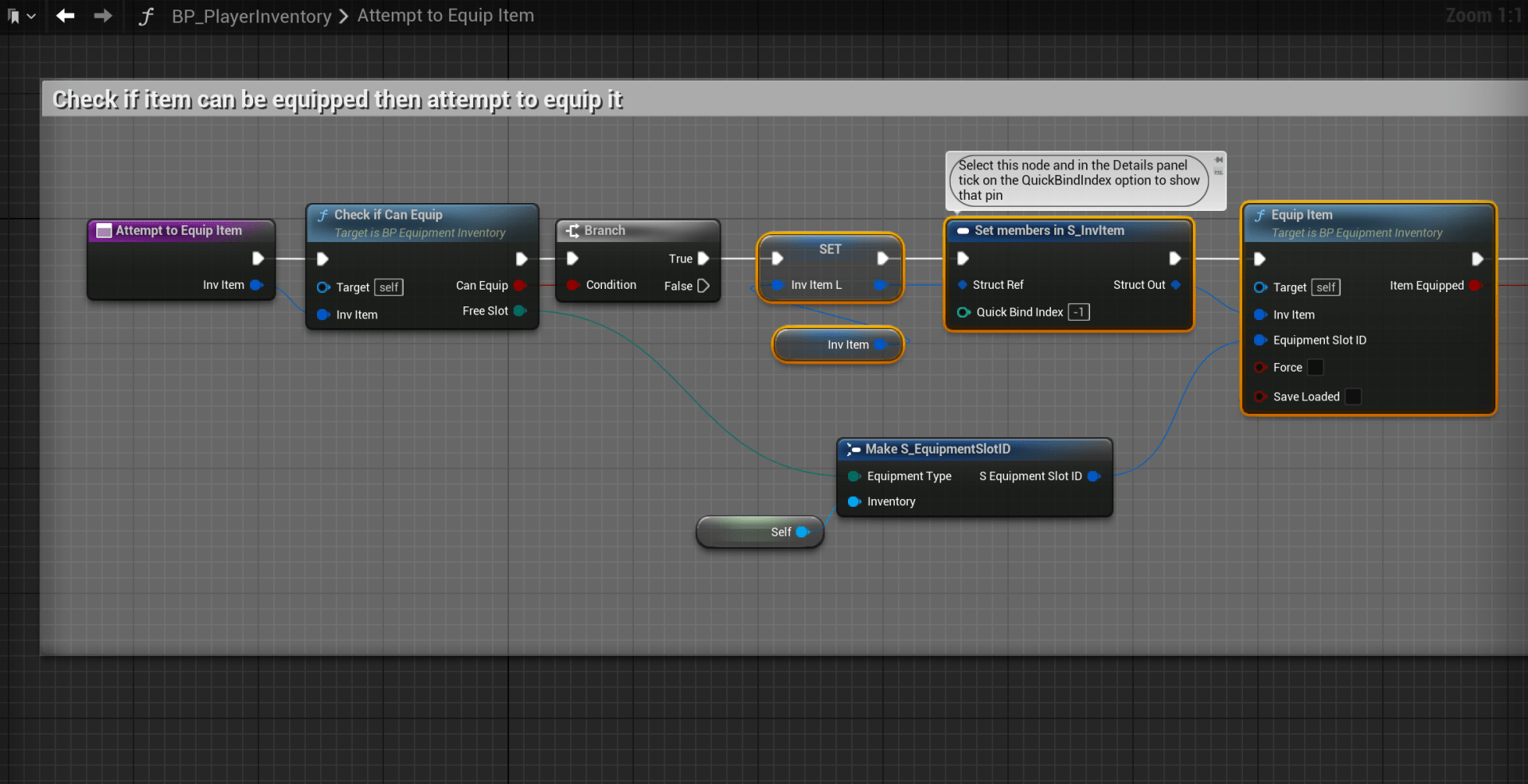 Open the BP_PlayerInventory then Open the AttemptToEquipItem function and create a new local variable called InvItemL and set its type to S_InvItem then copy the image below.