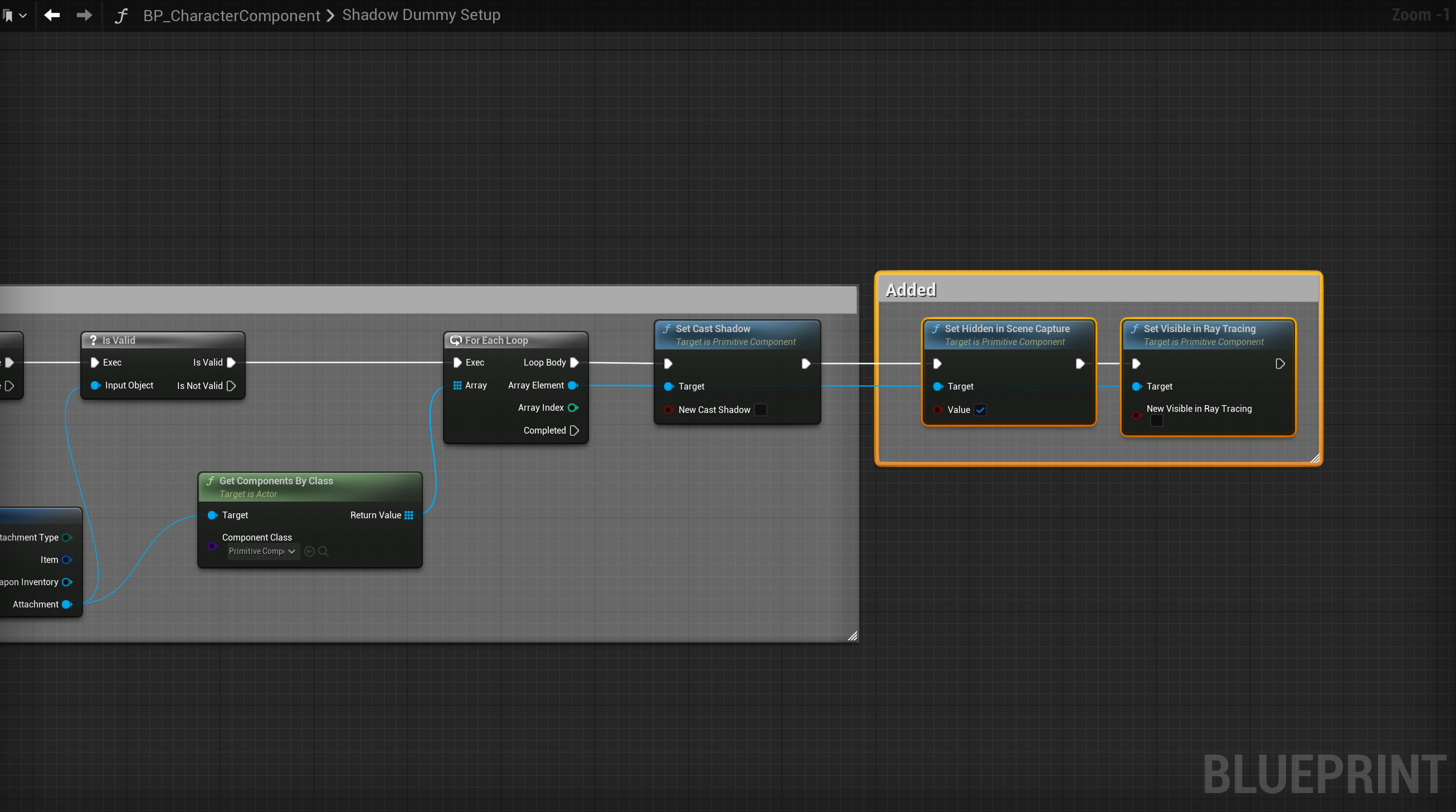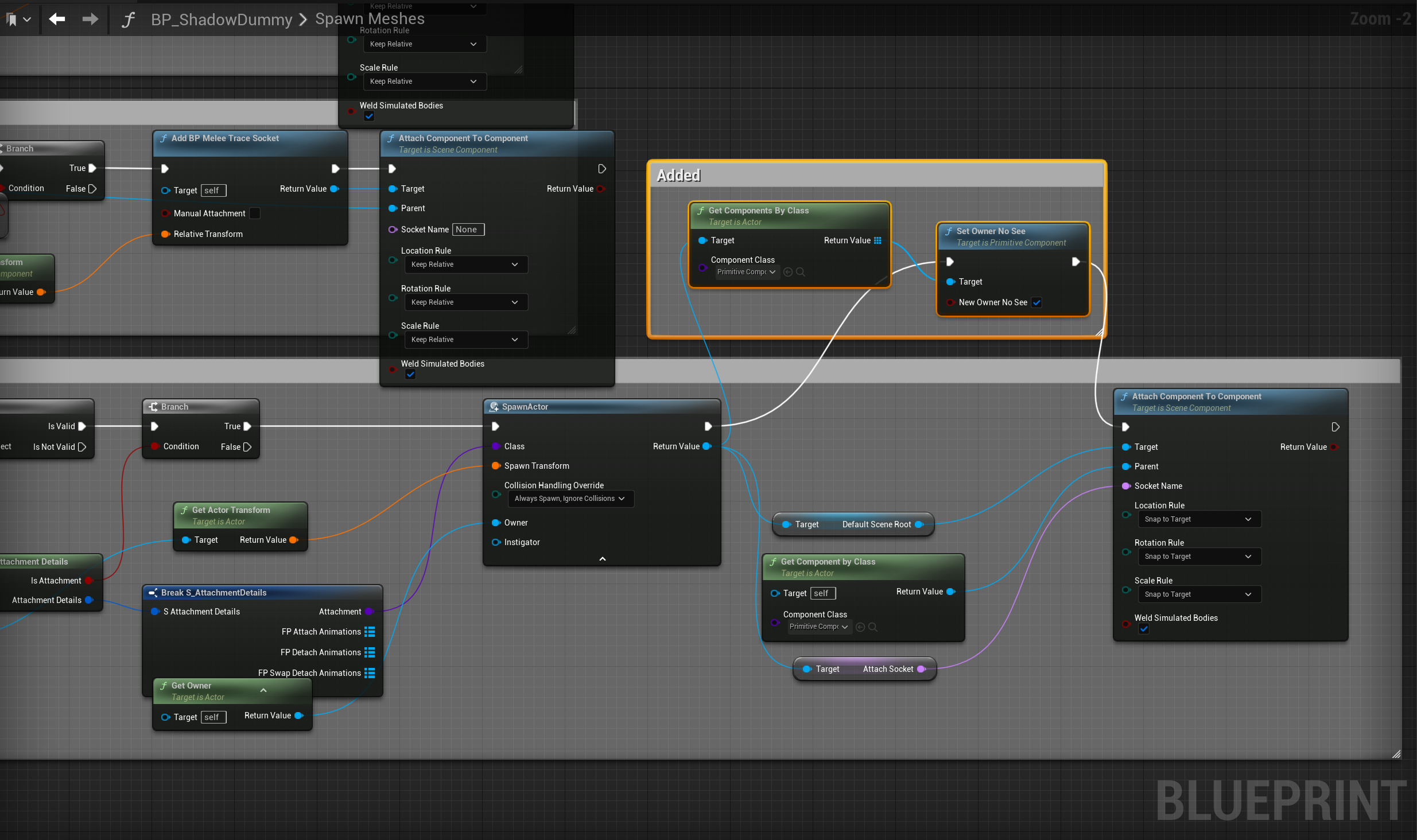 Go to the BP_ShadowDummy then to the SpawnMeshes function and select the Add Static Mesh Component node then in the details copy the settings shown below.