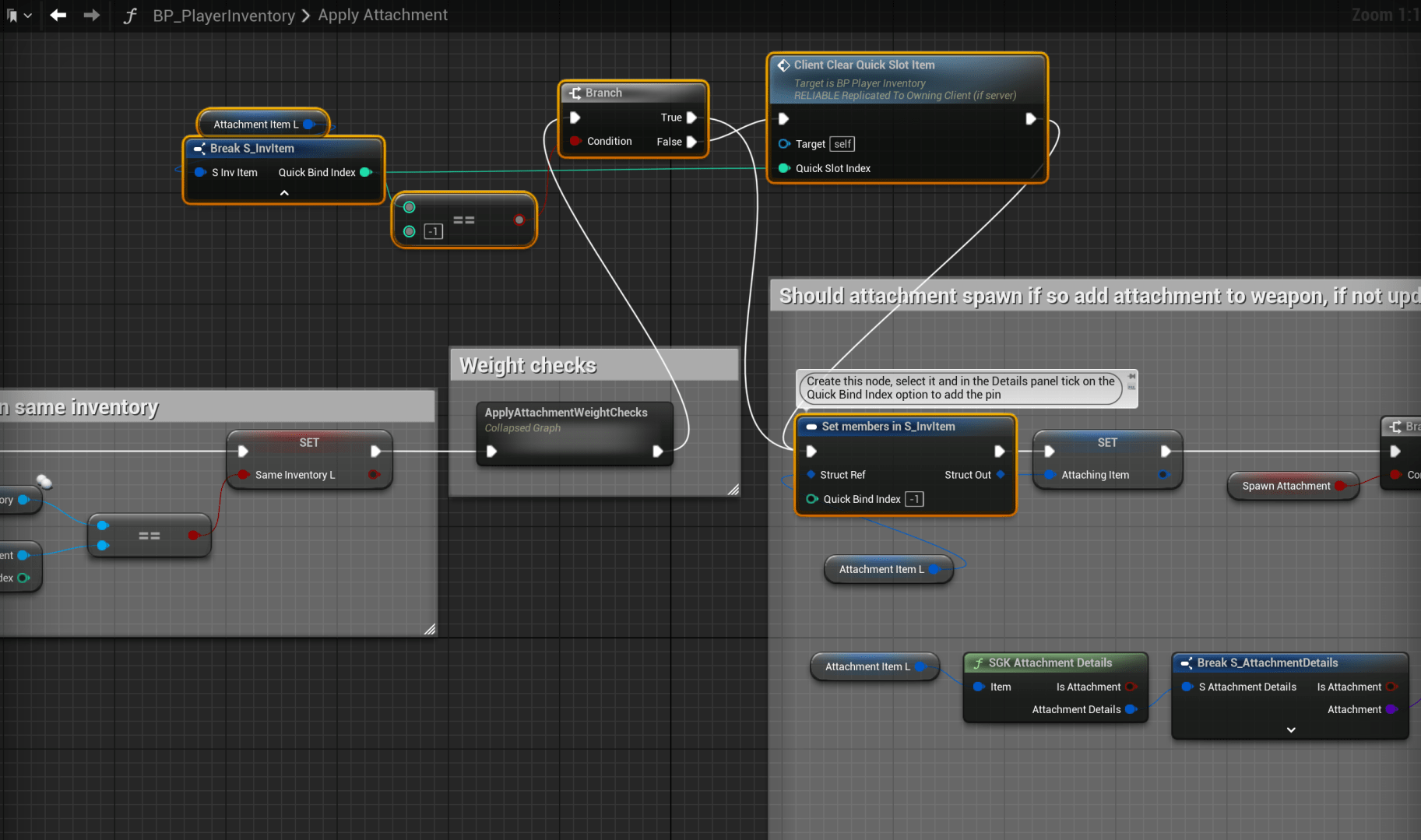 Open the BP_PlayerInventory blueprint then add the highlighted nodes shown in the image below, locations at the tops of the screenshots.