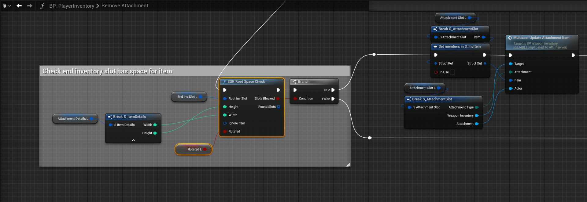 SGK V2 – Fixed Incorrect Rotated node in RemoveAttachment Open the BP_PlayerInventory and replace the Rotated node with the Rotated L node like shown in the image below.