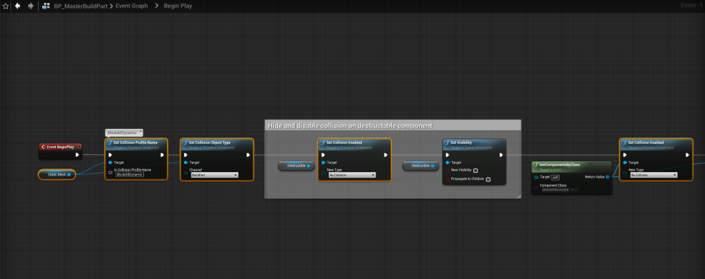 Go to the BP_MasterBuildPart and Add the Set Collision Profile Name node and set the In Collision Profile Name value on that node to BlockAllDynamic like the image below shows. Then add the Set Collision Object Type node and set the Channel to BuildPart.