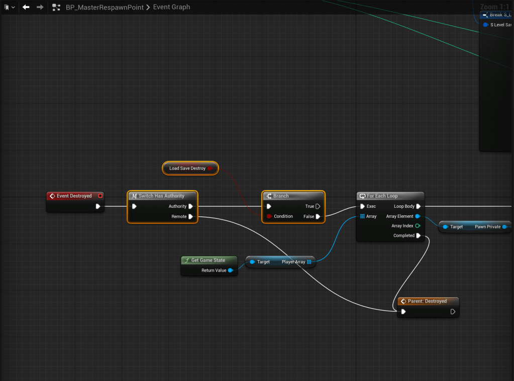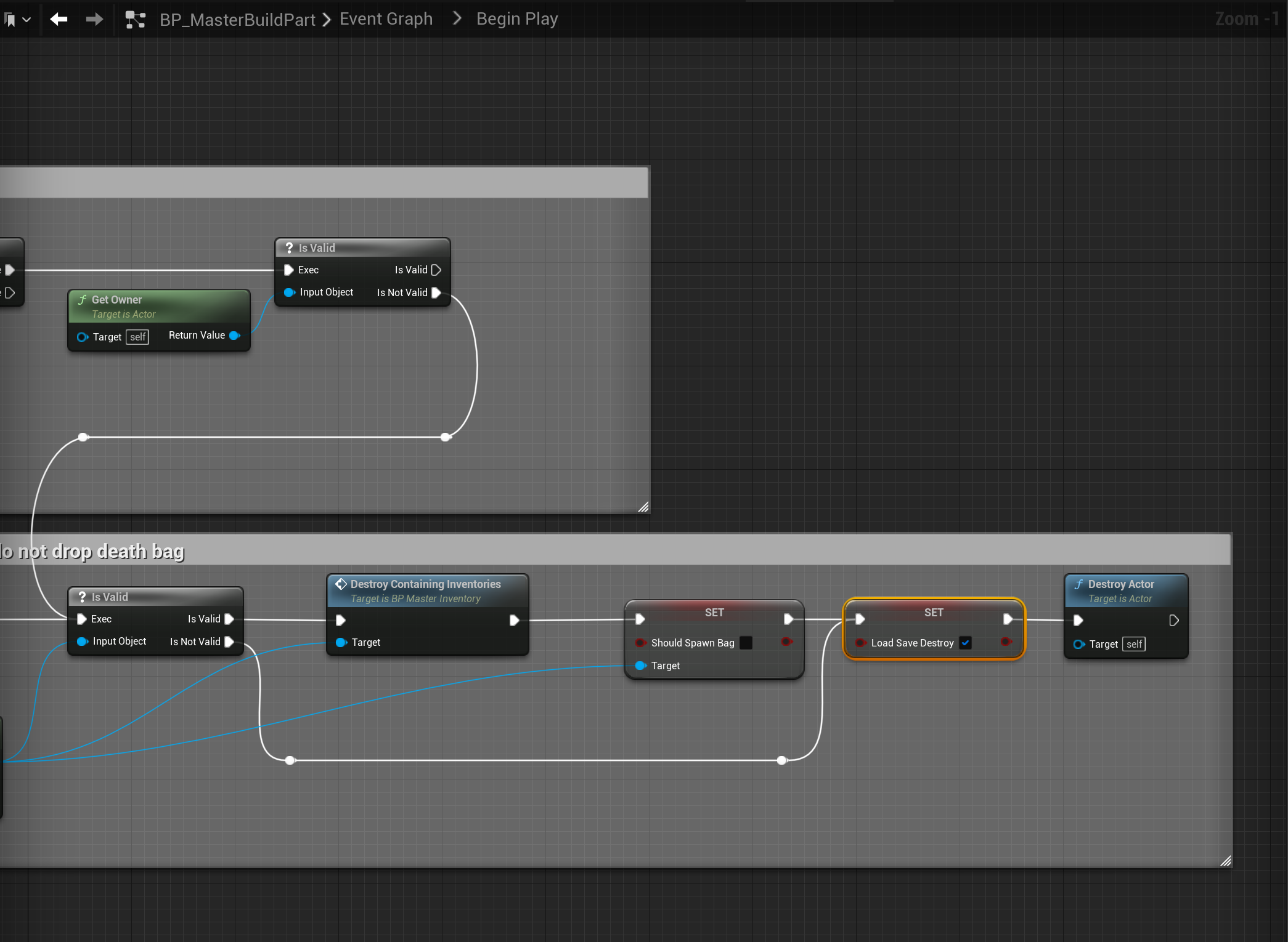 SGK V2 – Fixed issue with respawn point loading on in game load Go to the BP_MasterBuildPart and create a new variable called LoadSaveDestroy and set it to a Boolean. Then compile and save. Add the highlighted nodes shown in the image below, location at the top of the image.