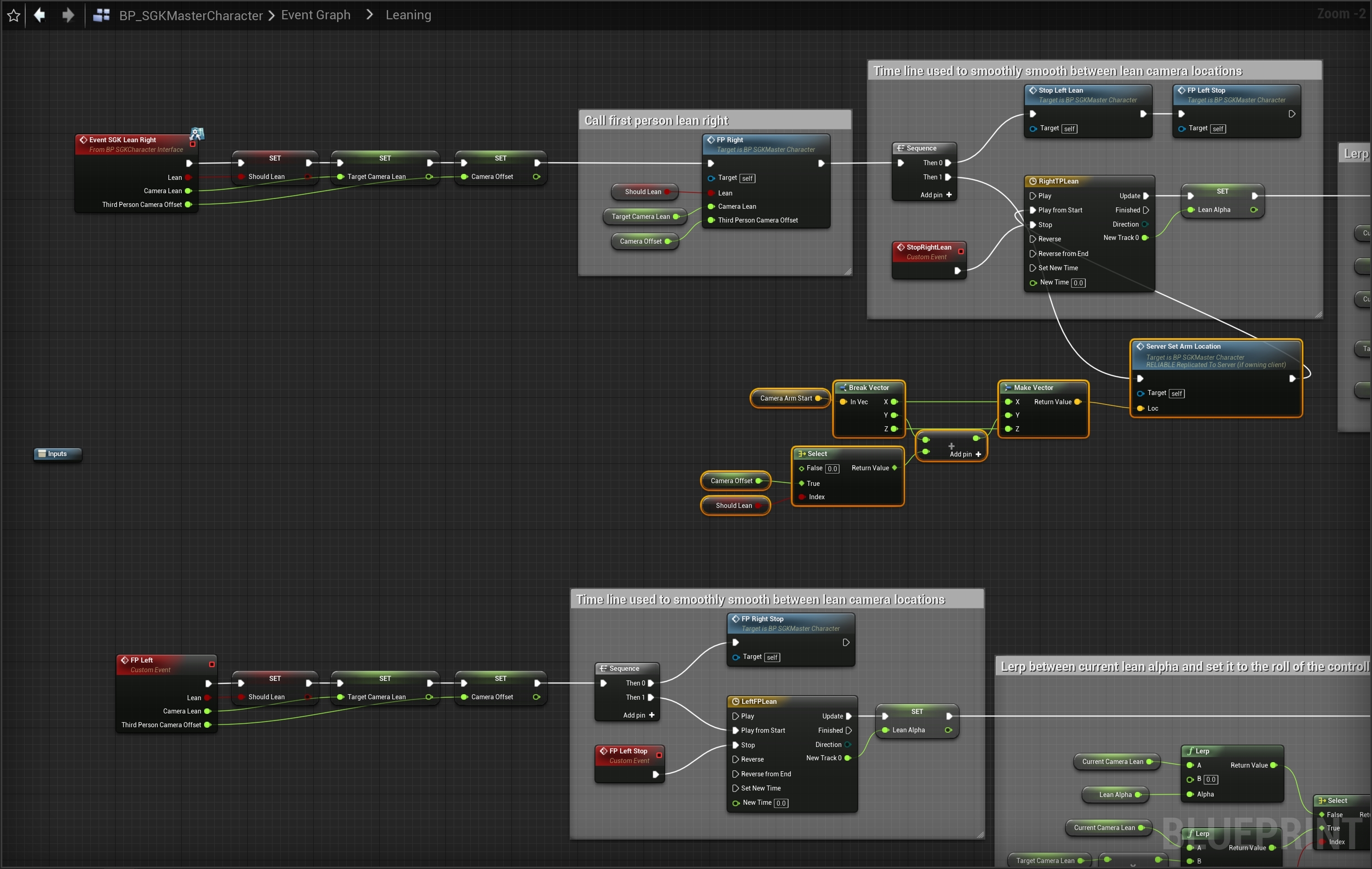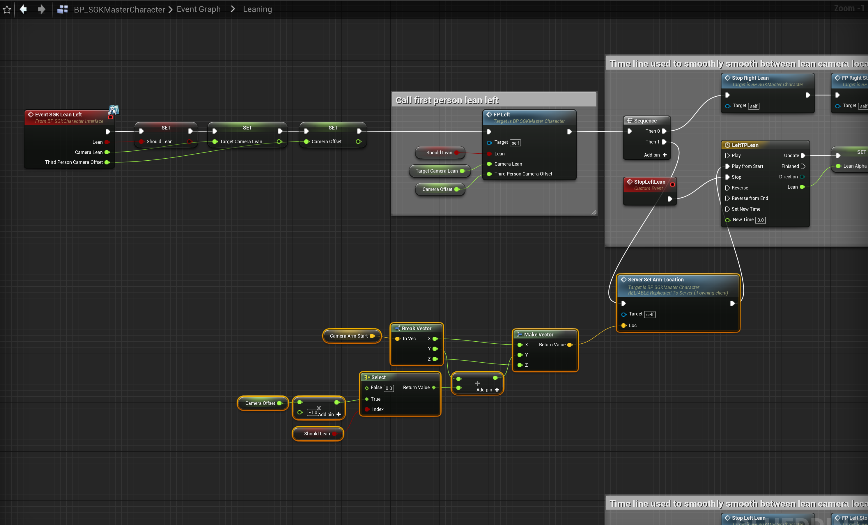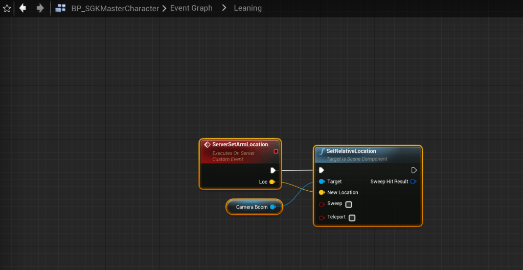 Go to the BP_SGKMasterCharacter and create a new custom event called ServerSetArmLocation and add a new input called Loc and set the type to Vector then tick the Reliable tick box. Next copy the images below by adding the highlighted nodes.