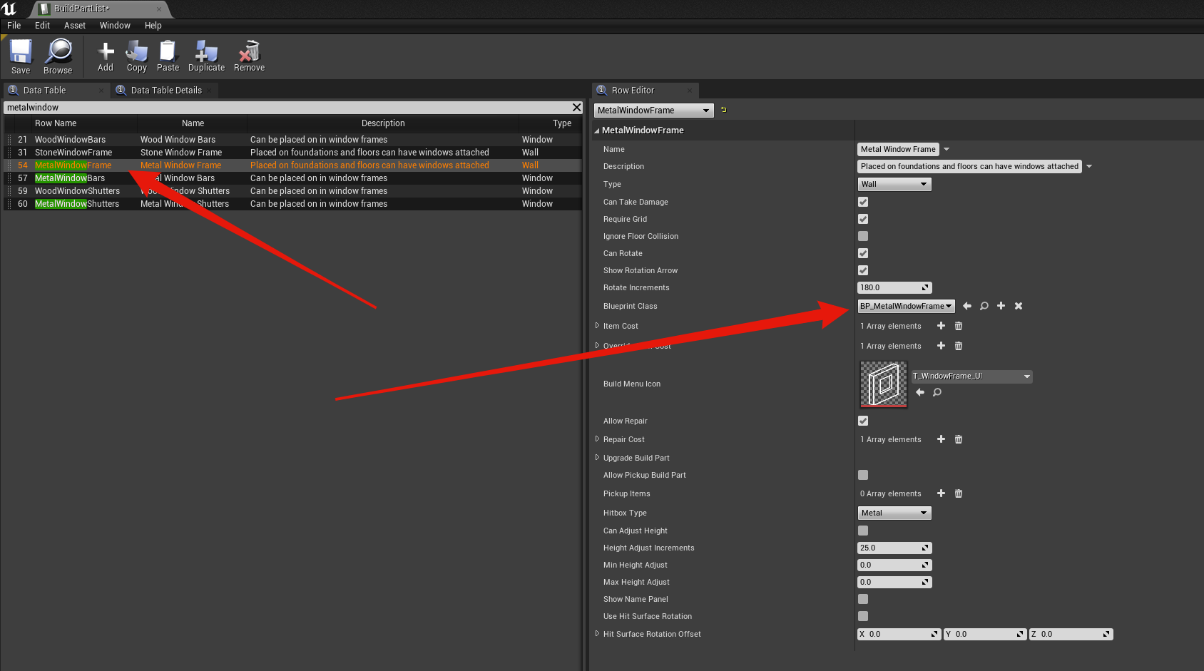SGK V2 – Fixed metal window frame Go to the BuildPartList and select the MetalWindowFrame row and set the Blueprint Class to what the image below shows.