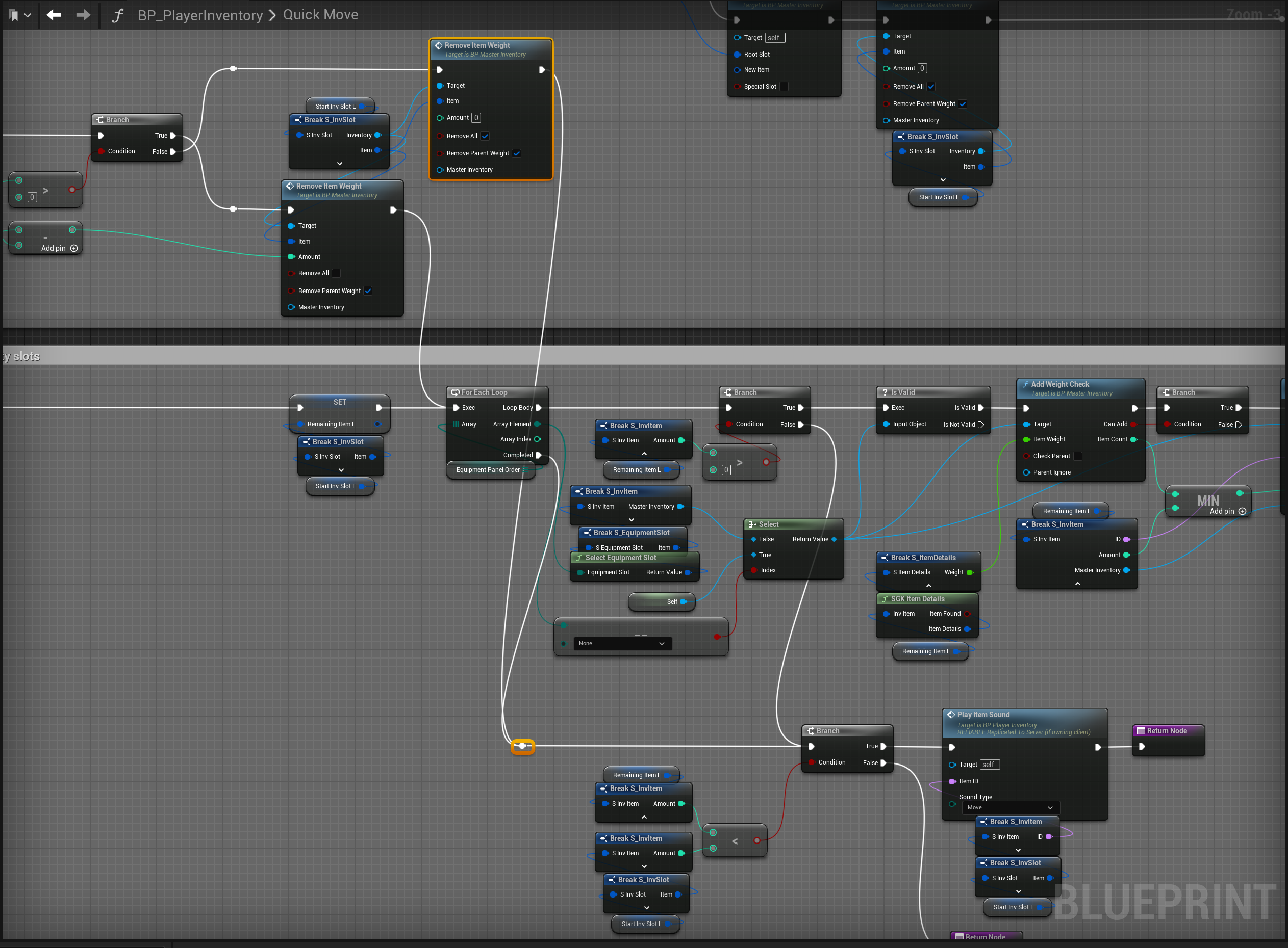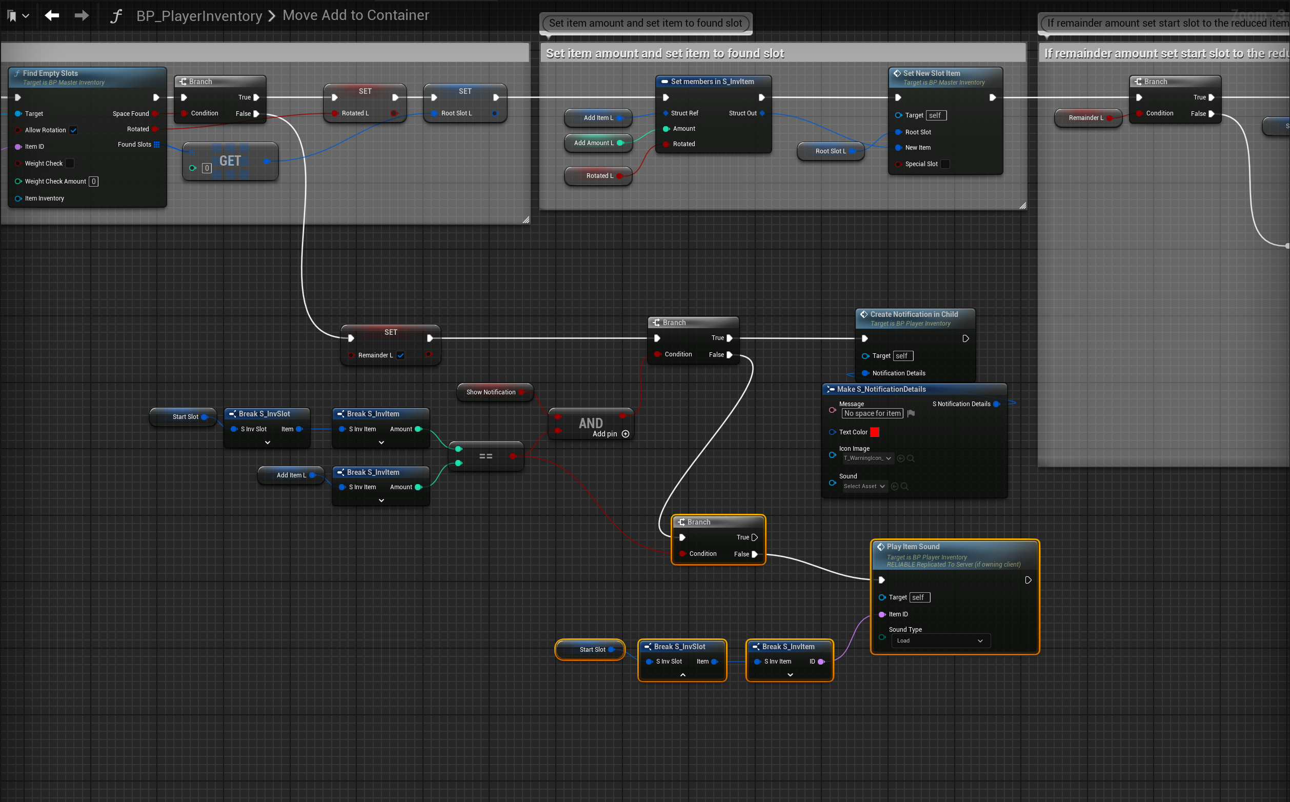 Open the BP_PlayerInventory then open the MoveAddToContainer function and add the nodes shown in the image below.