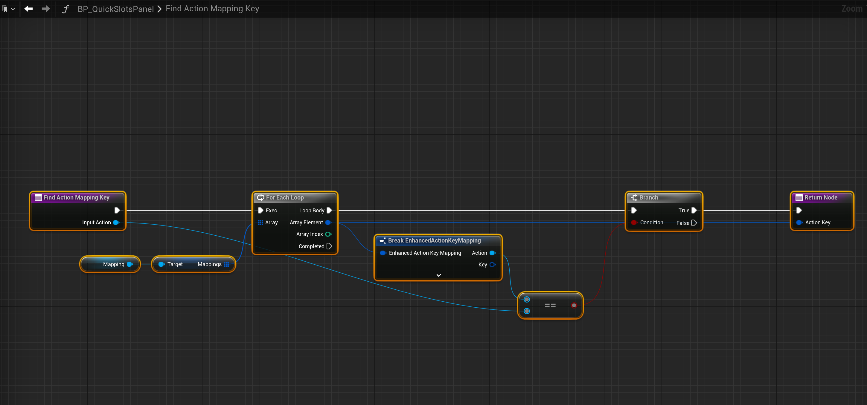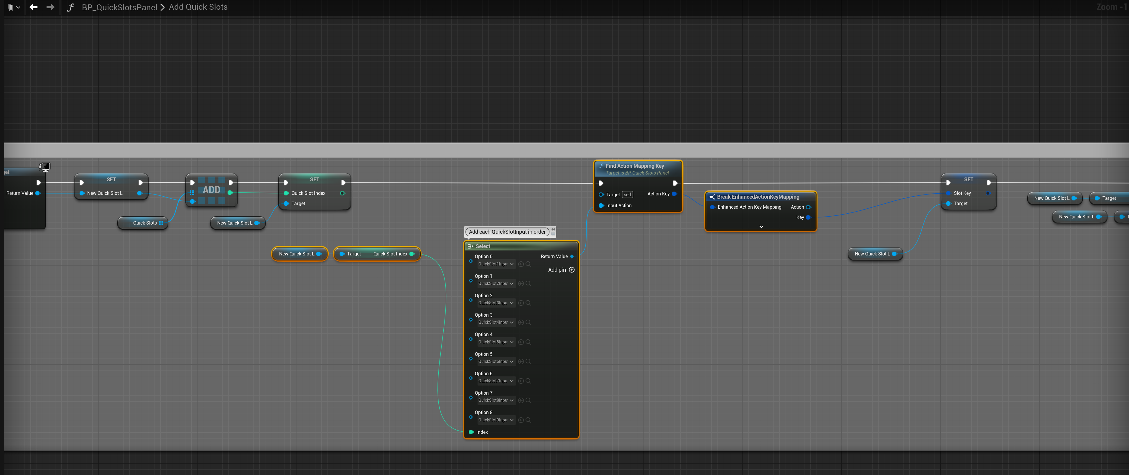 Go to the BP_QuickSlotsPanel widget and create a new function called FindActionMappingKey.