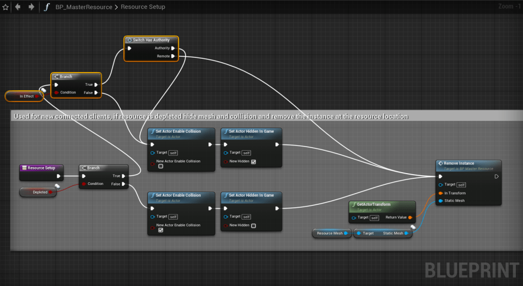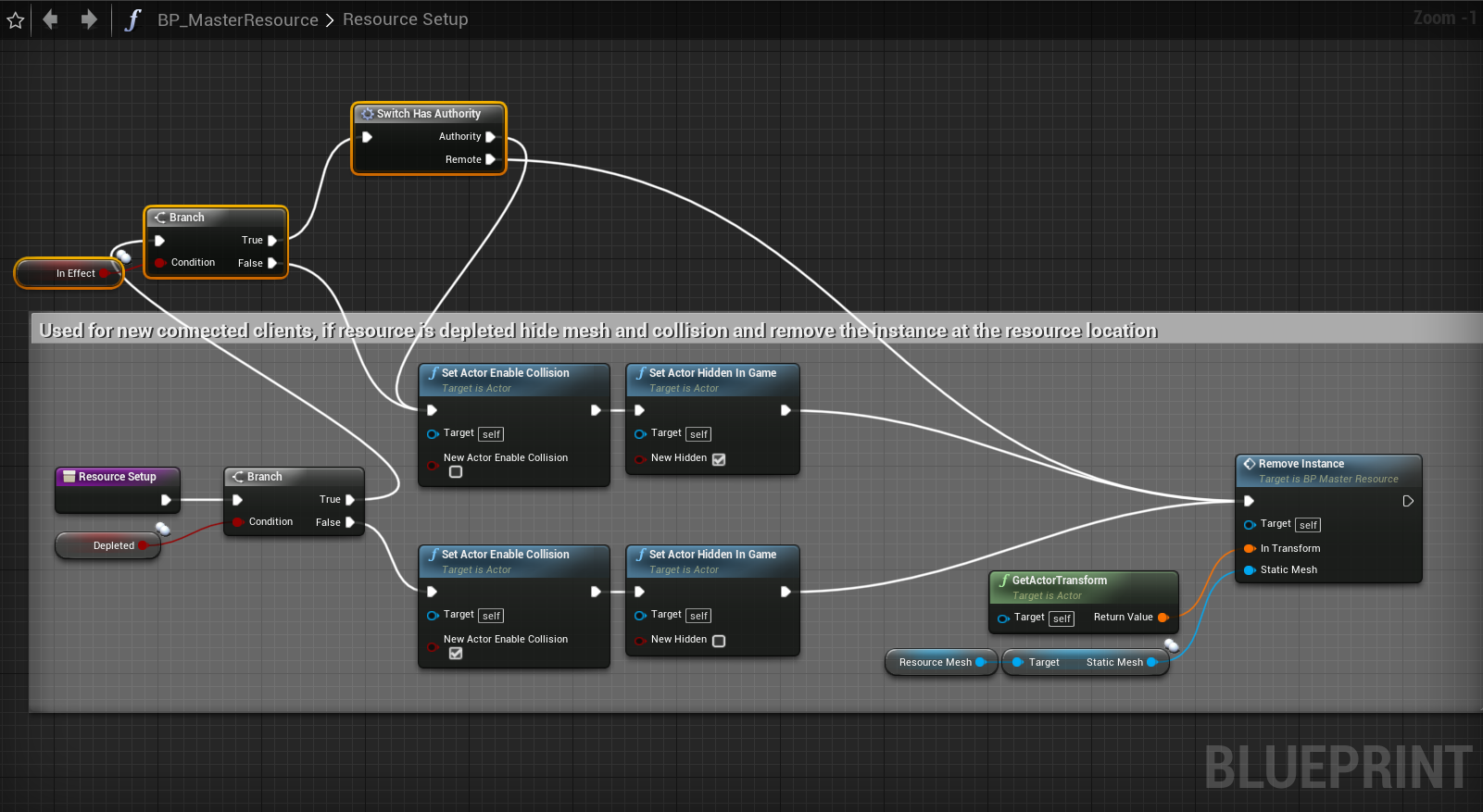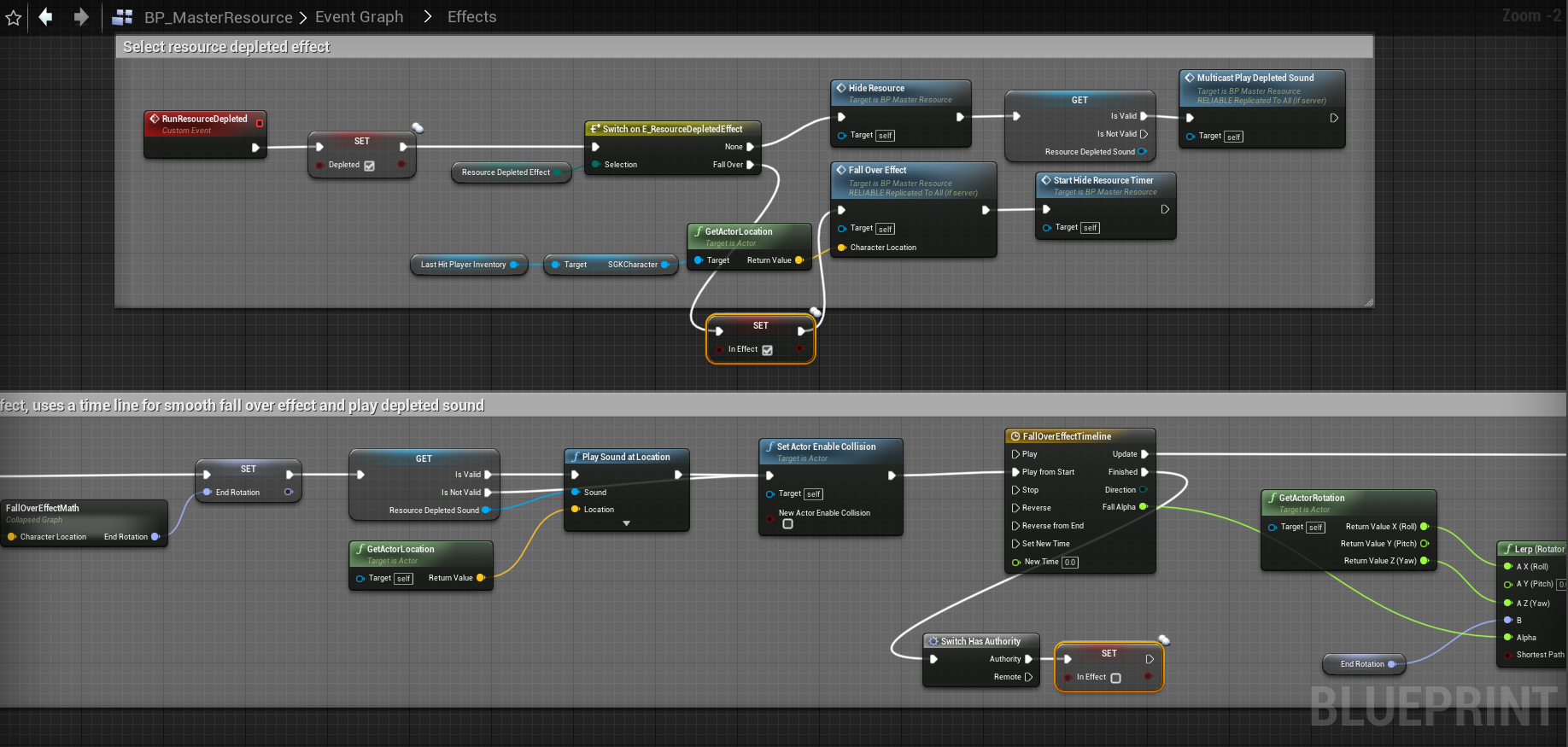 SGK V2 – Fixed resource effect not showing for client for low amount resources Go to the BP_MasterResource and create a new variable called InEffect and set it to a Boolean and set it to Replicated. Add the highlighted nodes shown in the image below, location at the top of the image.