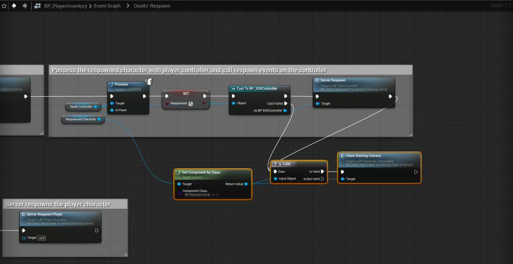 Go to the BP_CharacterComponent then go to the BeginPlay collapsed node and create a new custom event called ClientStartingCamera and set it to Run On Owning Client and tick on Reliable. Then copy the image below.