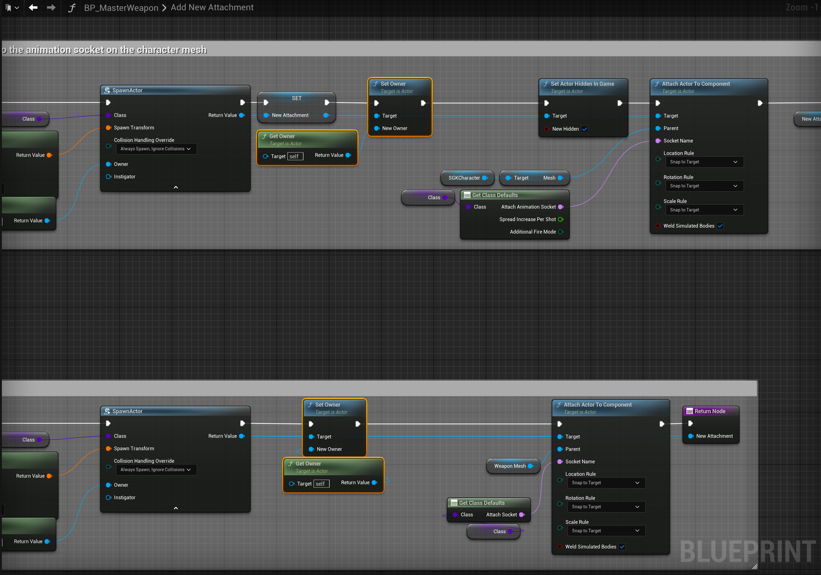 Open the BP_MasterWeapon then open the AddNewAttachment function and add the highlighted nodes shown in the image below.