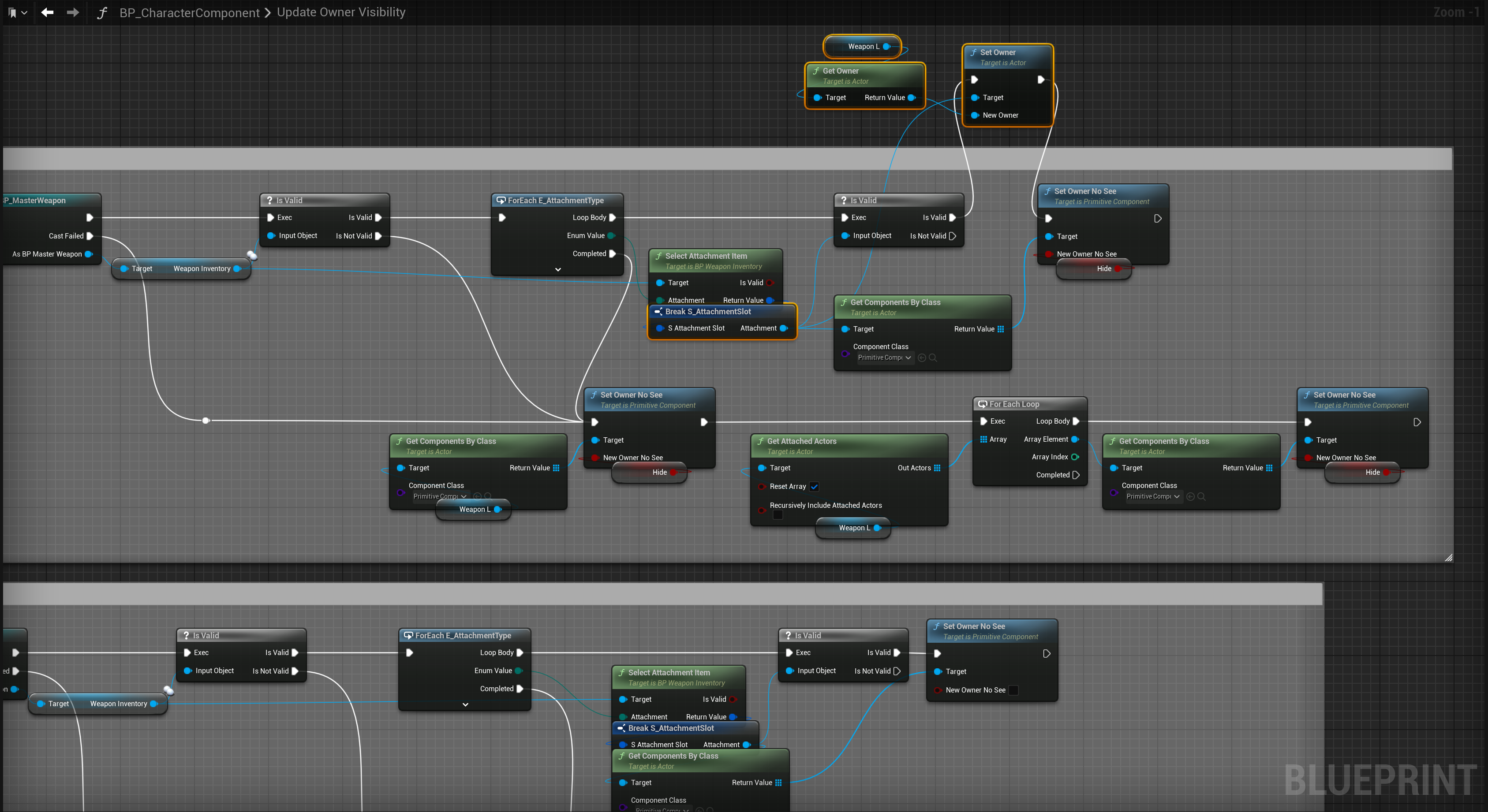 Then open the BP_CharacterComponent and open the UpdateOwnerVisibility function and add the highlighted nodes in the image below.
