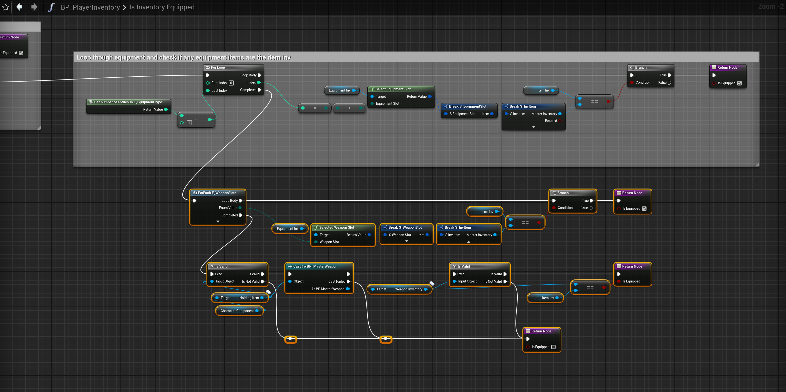 SGK V2 – Fixed Using Players Remove From Holding Item Open the BP_PlayerInventory then open the IsInventoryEquipped and add the highlighted nodes shown in the image below. If your using a UE4 version of SGKv2 your’ll need to add the highlighted nodes shown in the image below instead.