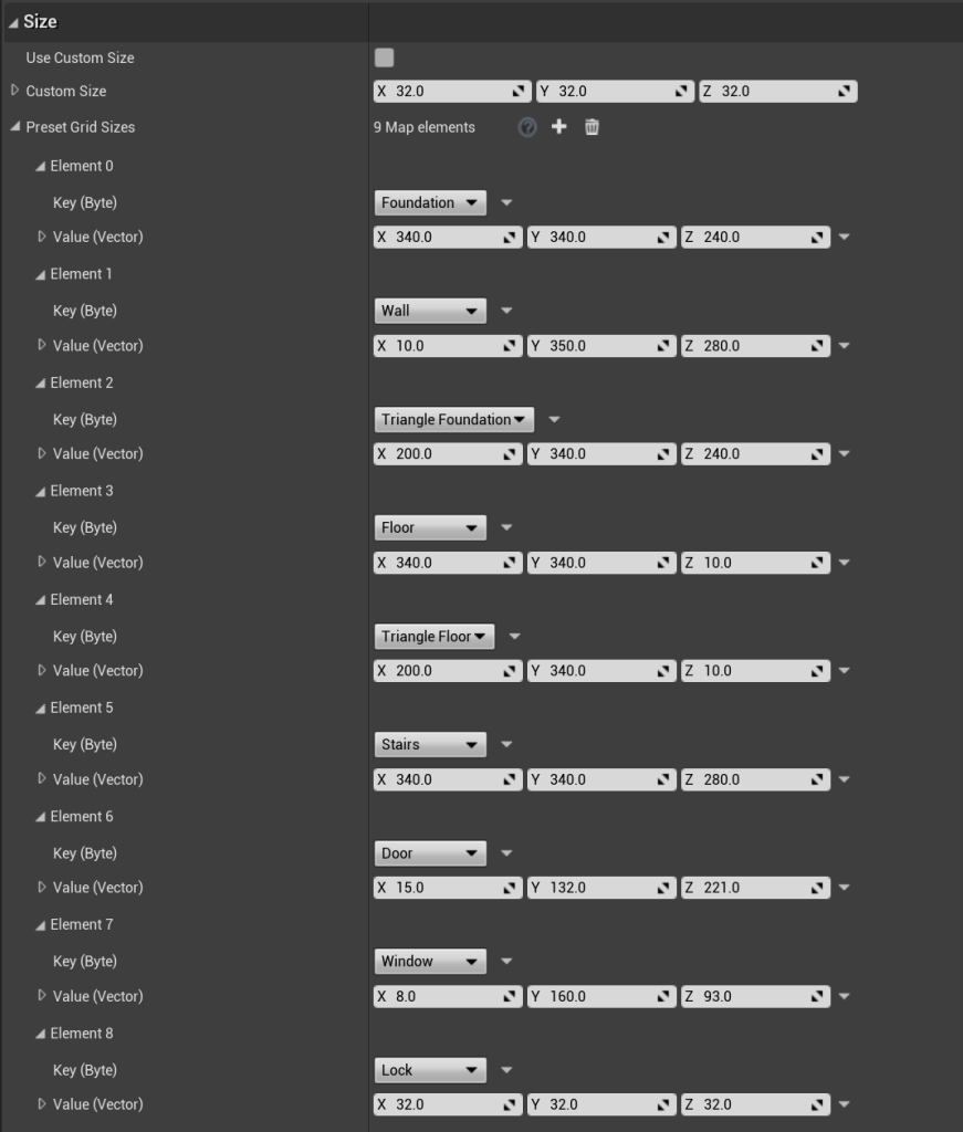 Here you can set the size of all the grids in the system for each build part type. NOTE changing these values in the BP_GridComponent will effect all the grid sizes of that type in the whole project.