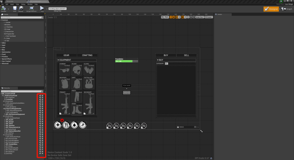 In Survival Game Kit V2 the main in game HUD layout is in the BP_InventoryHUD. Here you can change the location of UI elements, resize and customize how the UI looks. Keep in mind some UI elements are hidden by default to make it easier to work in the designer, you can hide and unhide in the highlighted area shown in the image below.
