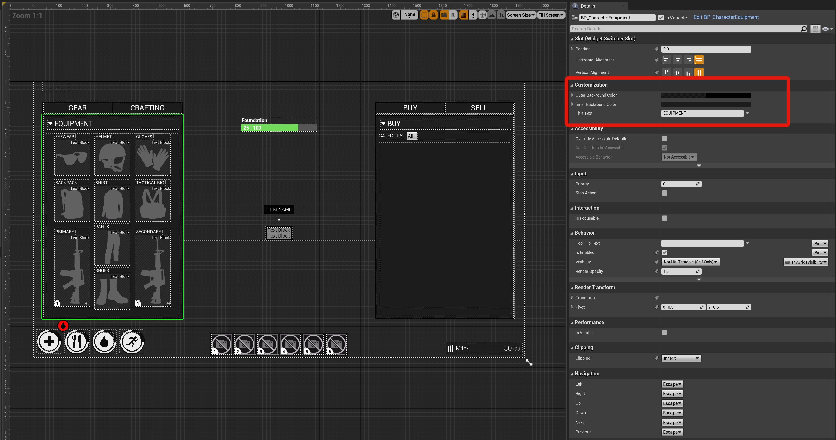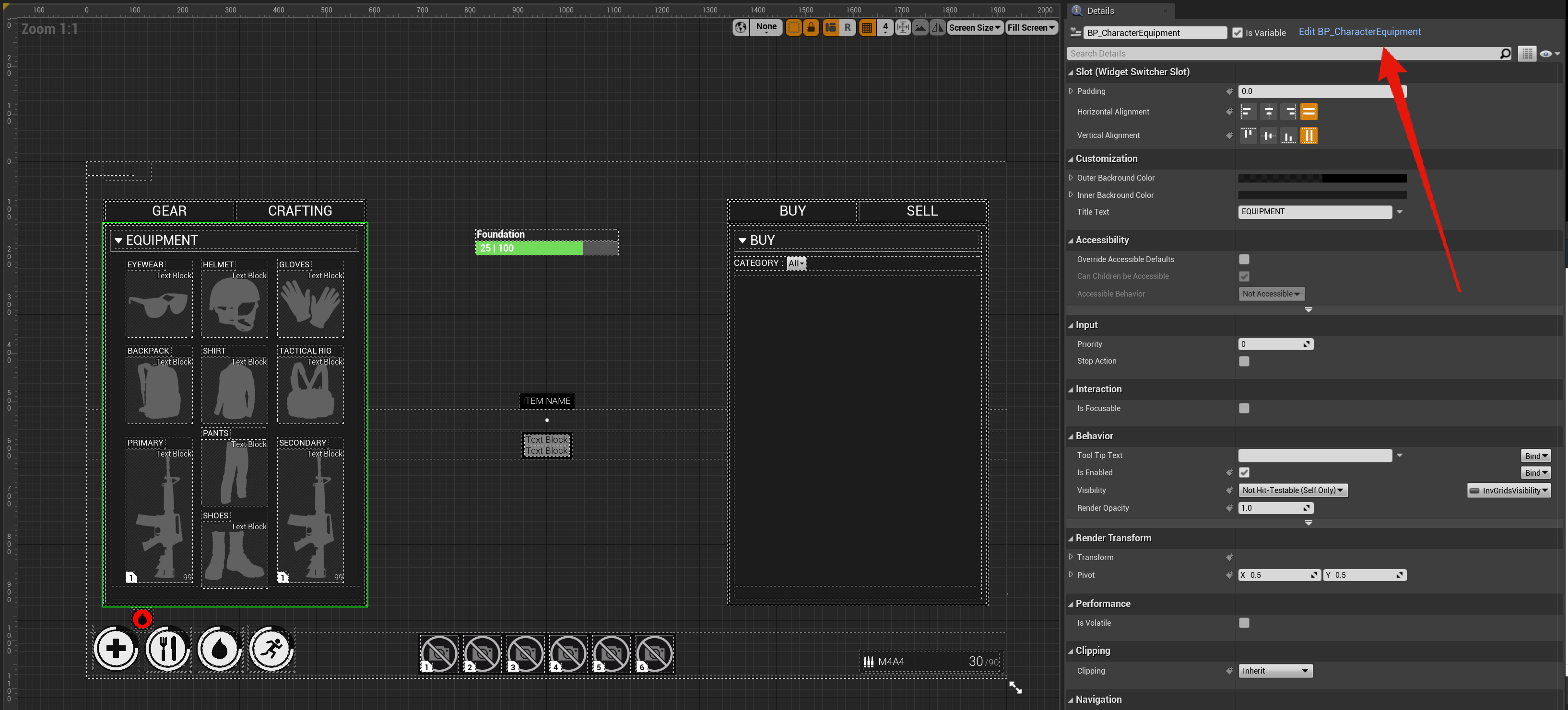If you want to change more about the widget then is allowed in the settings here you can select it and then select the Edit BP_CharacterEquipment (This an example name, the name will be what ever widget you curranty have selected) option like shown in the image below, this will open that widget which will allow you to change anything you want in that widget.