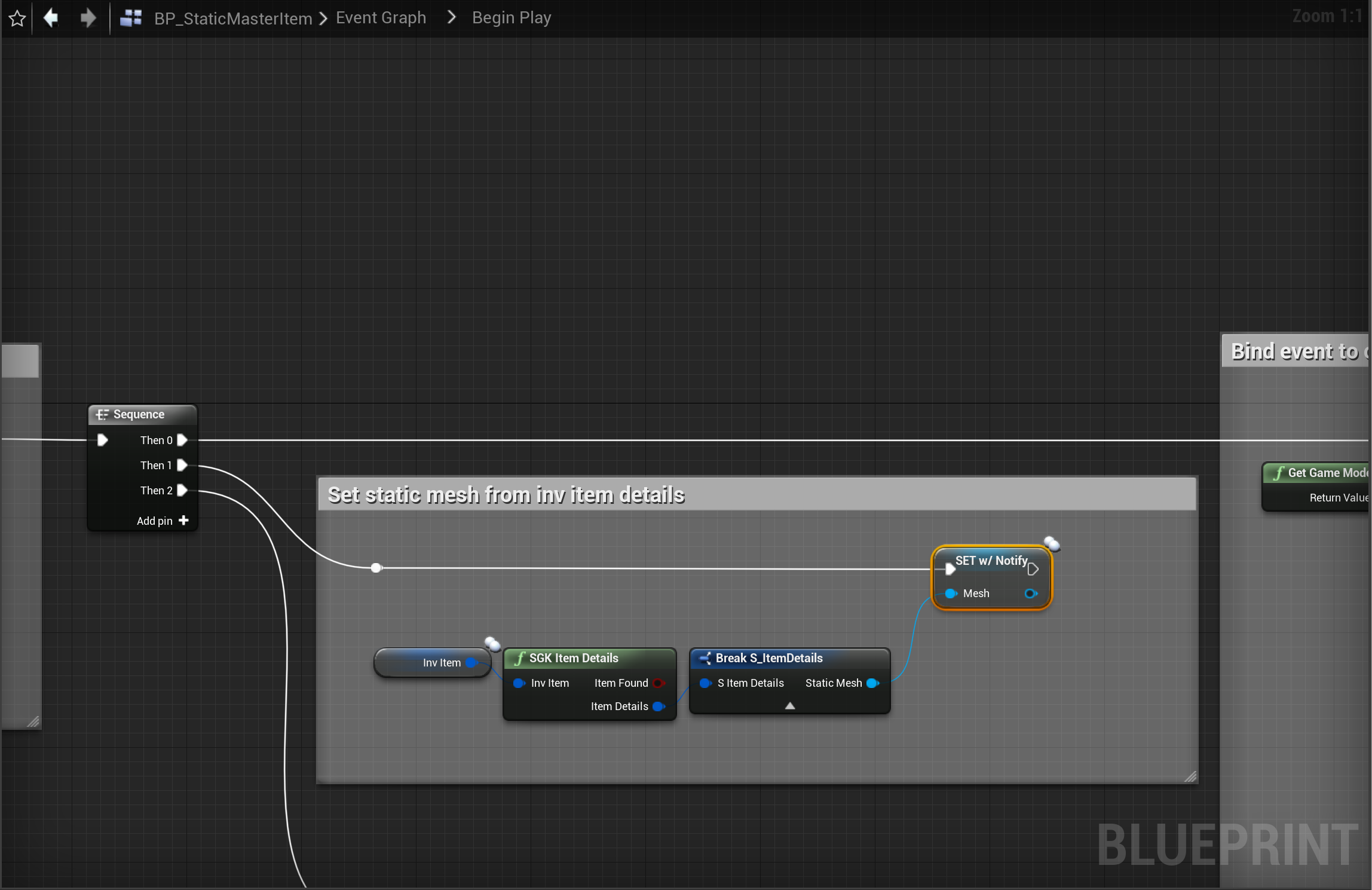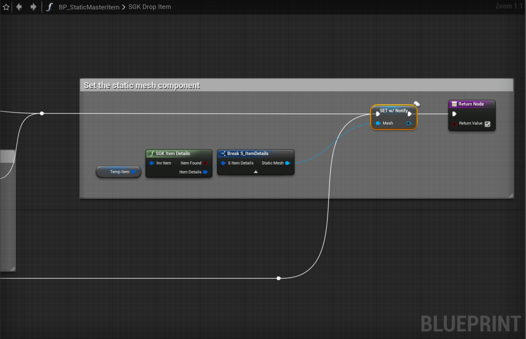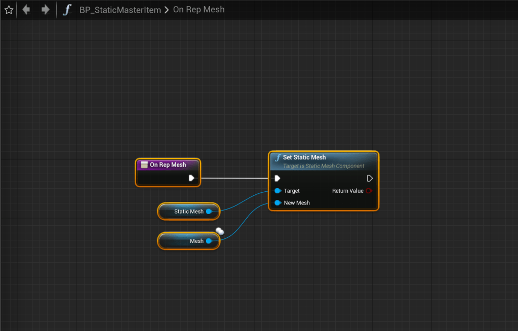 Go to the BP_StaticMasterItem and create a new variable called Mesh, set it to a StaticMesh type. Then set the Replication to RepNotify and compile the blueprint.
