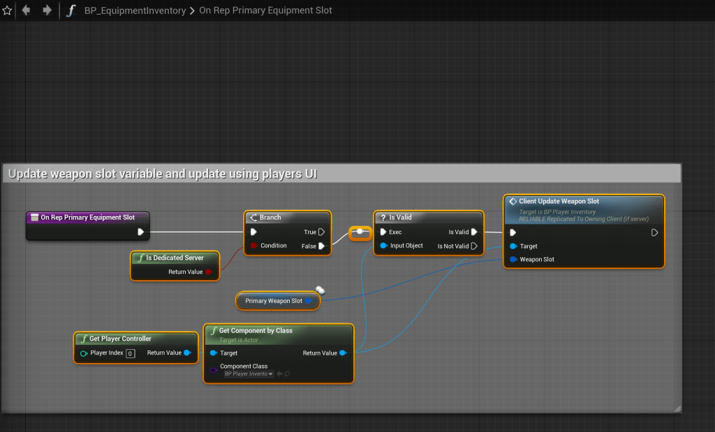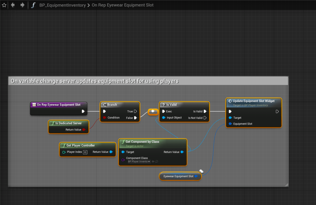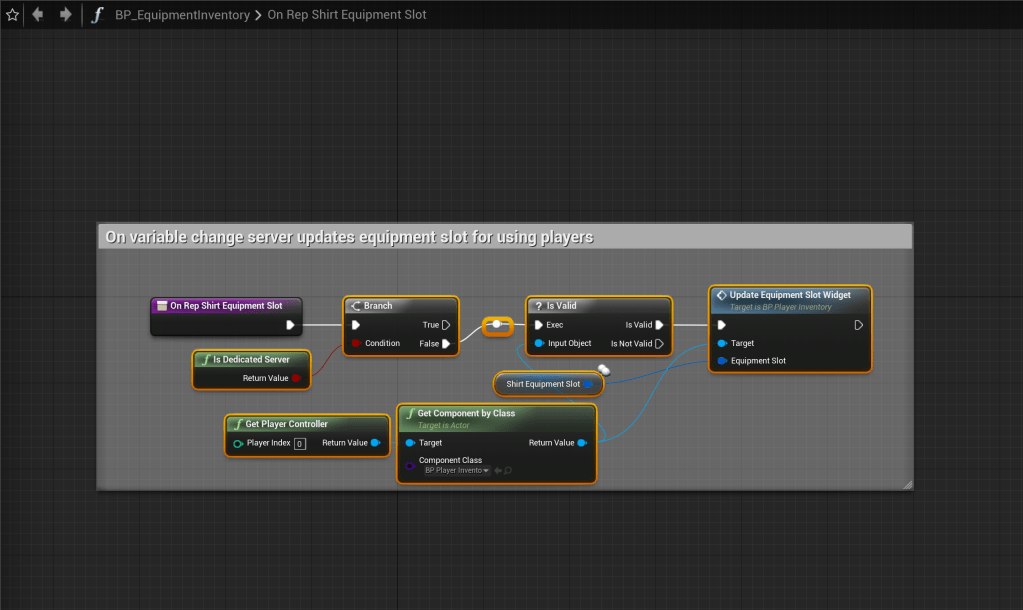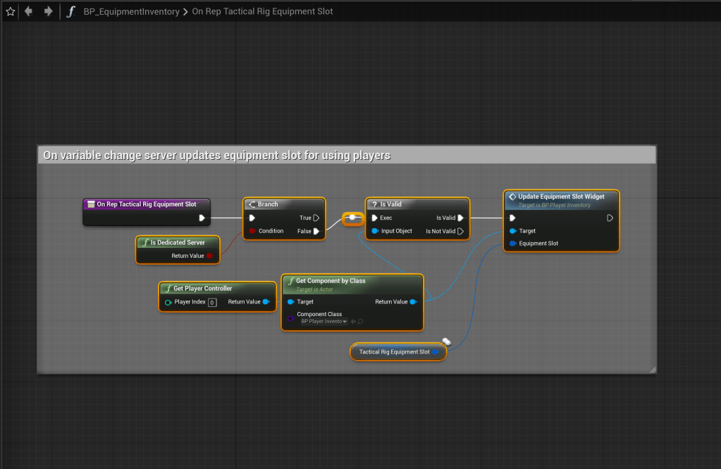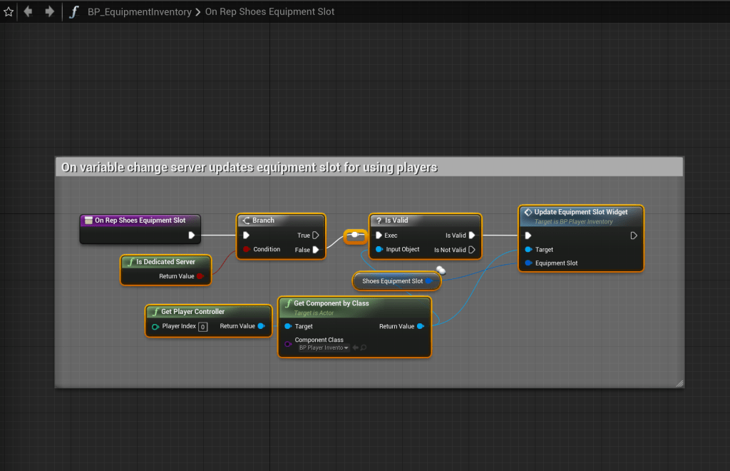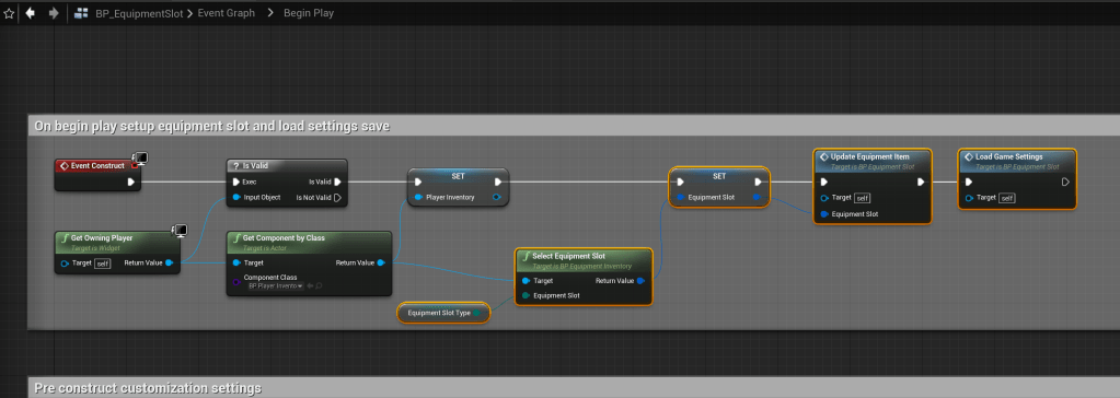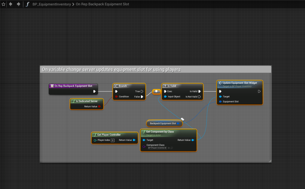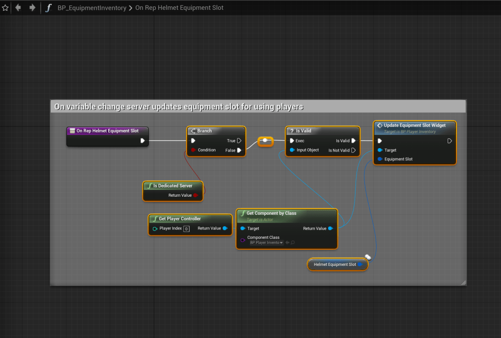 Go to the BP_EquipmentInventory and copy the images below. The Component Class of the Get Component By Class needs to be set BP_PlayerInventory.