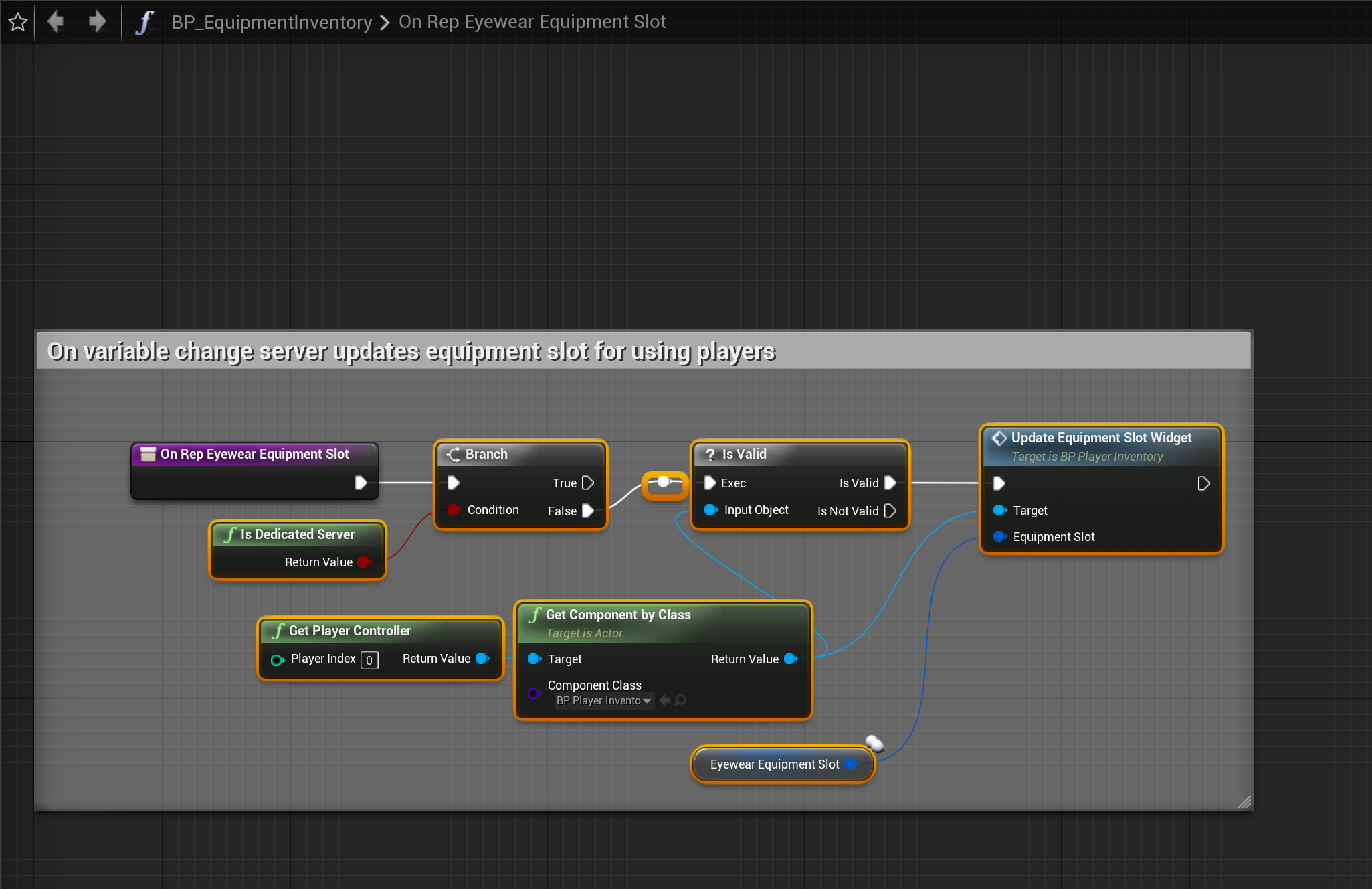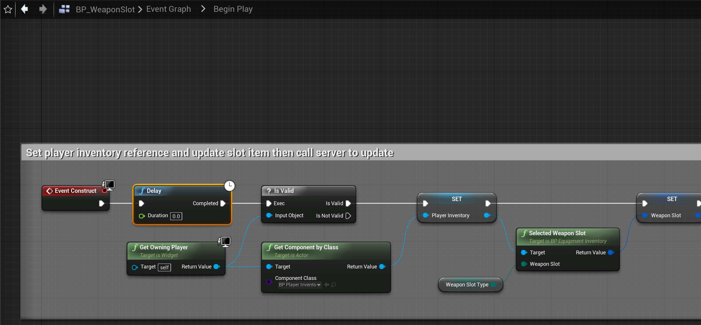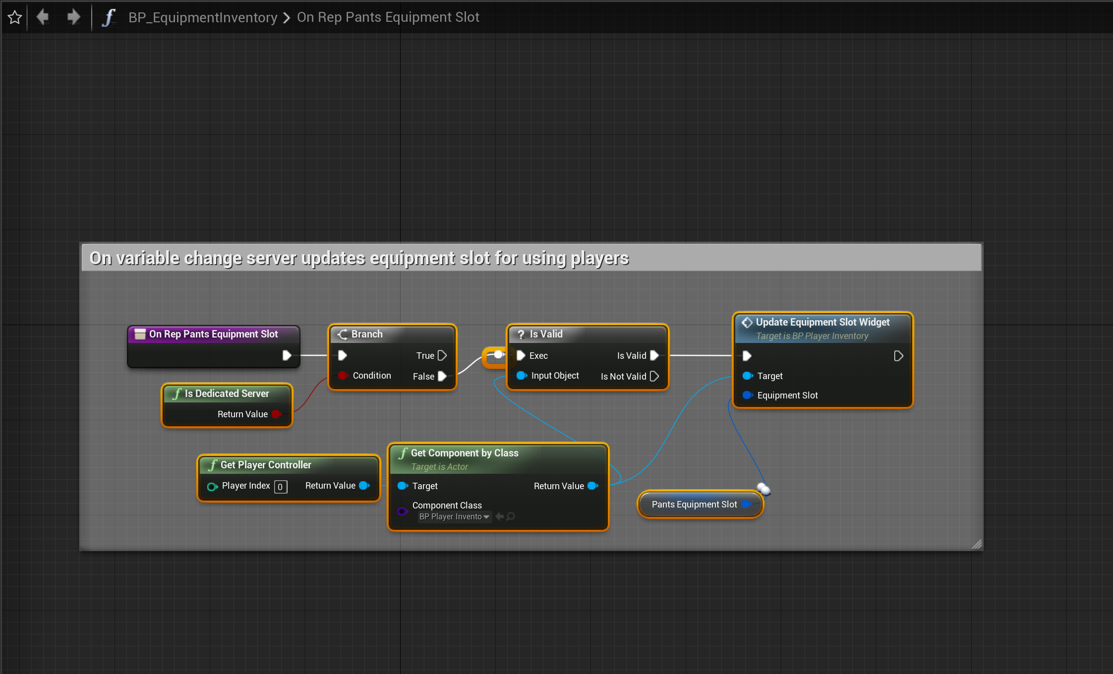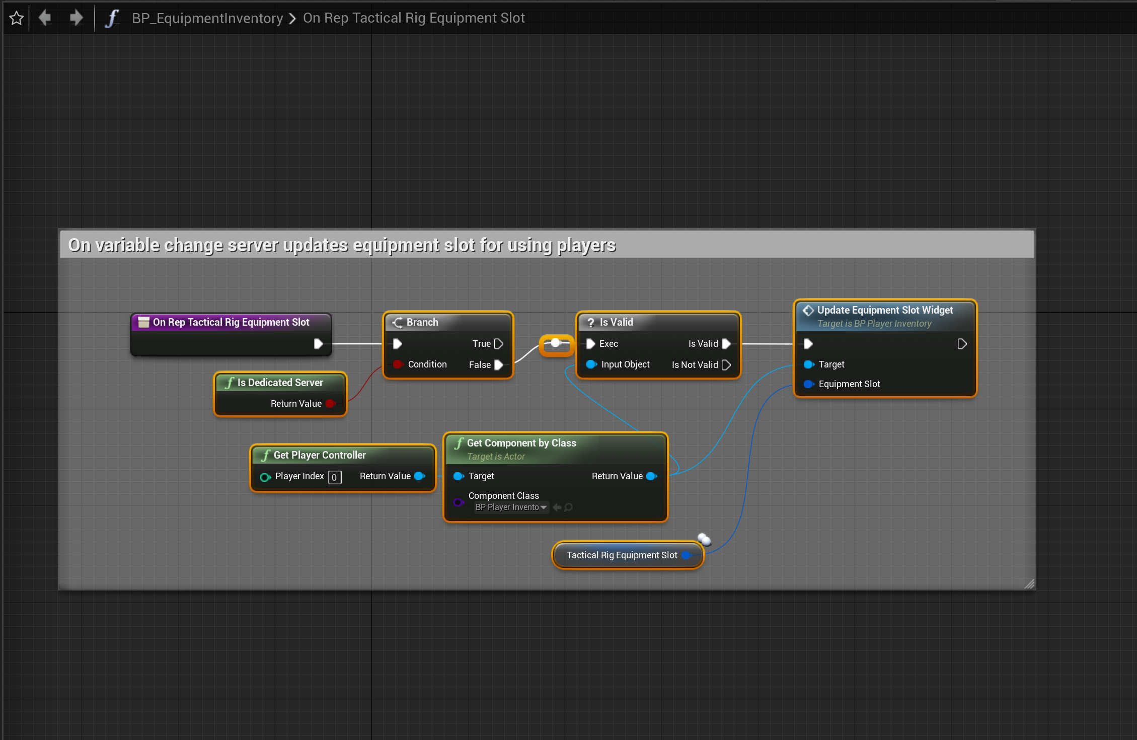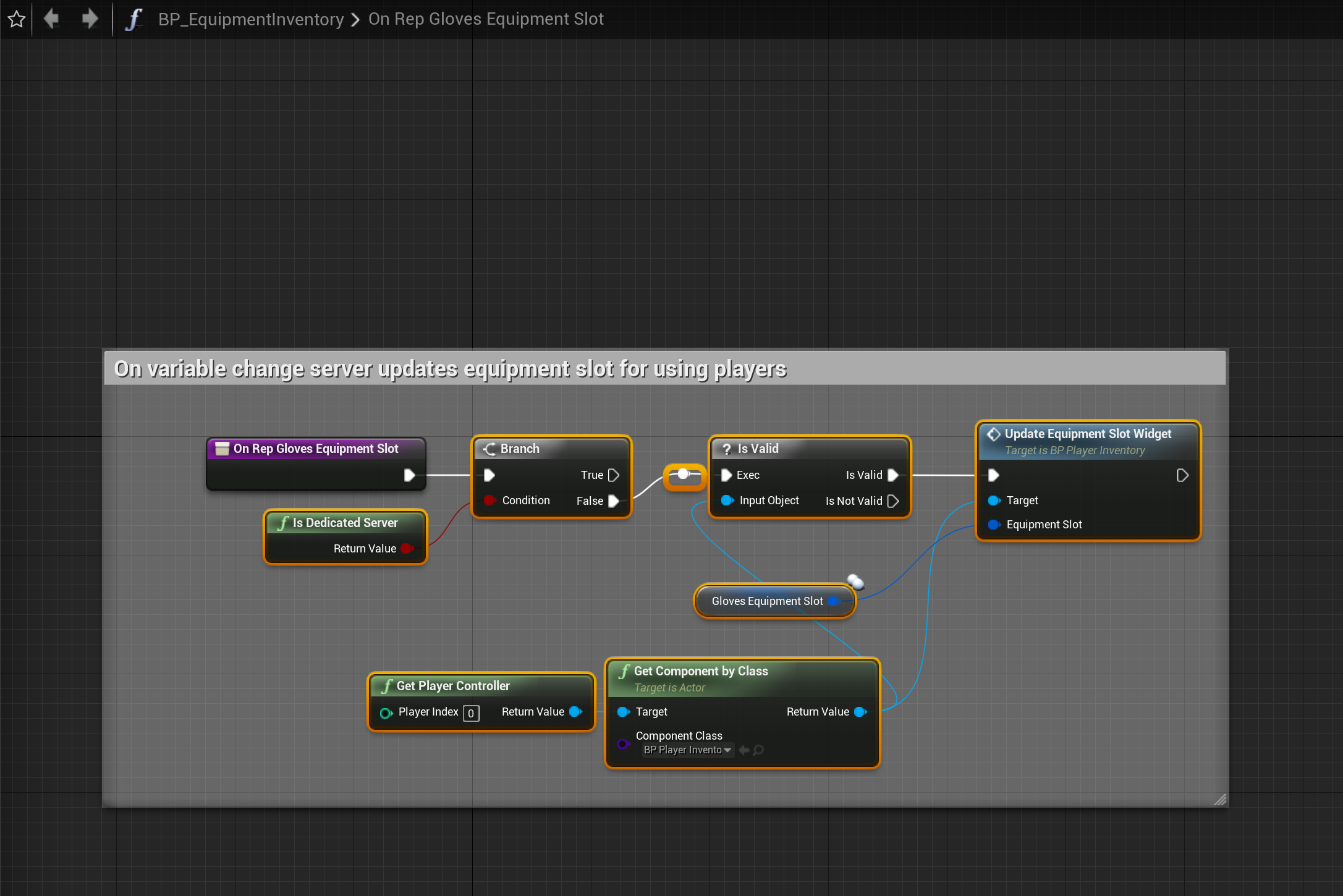 Go to the BP_EquipmentInventory and copy the images below. The Component Class of the Get Component By Class needs to be set BP_PlayerInventory.