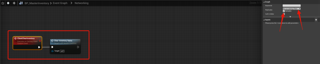 Add the new custom event shown in the image below in the BP_PlayerInventory make sure to set it to Run on Client and tick Reliable then copy the image.