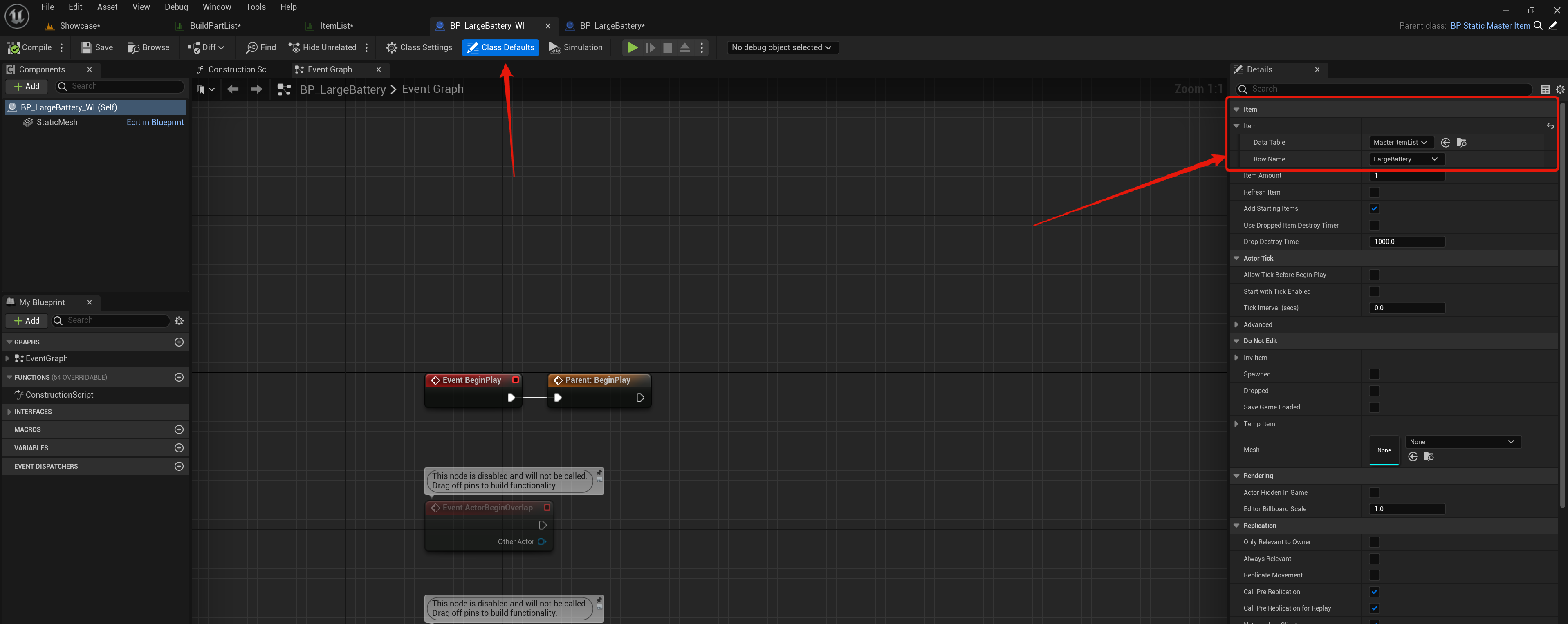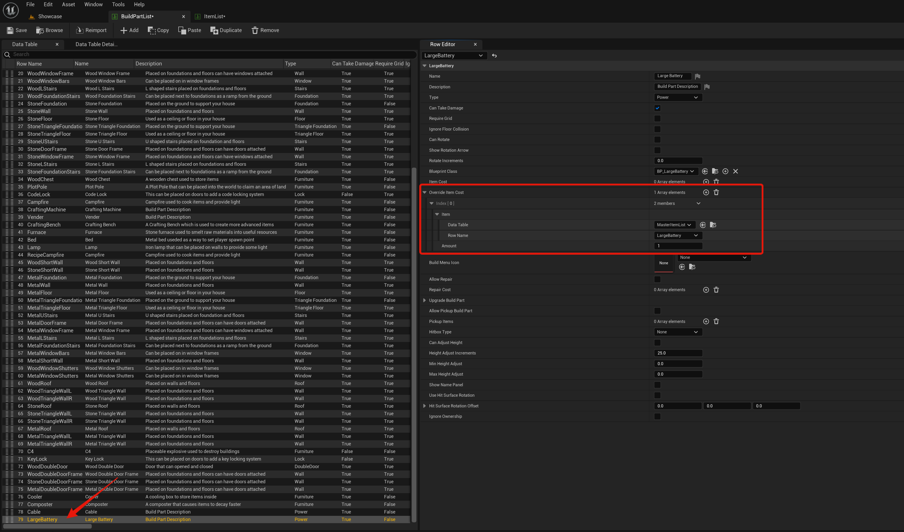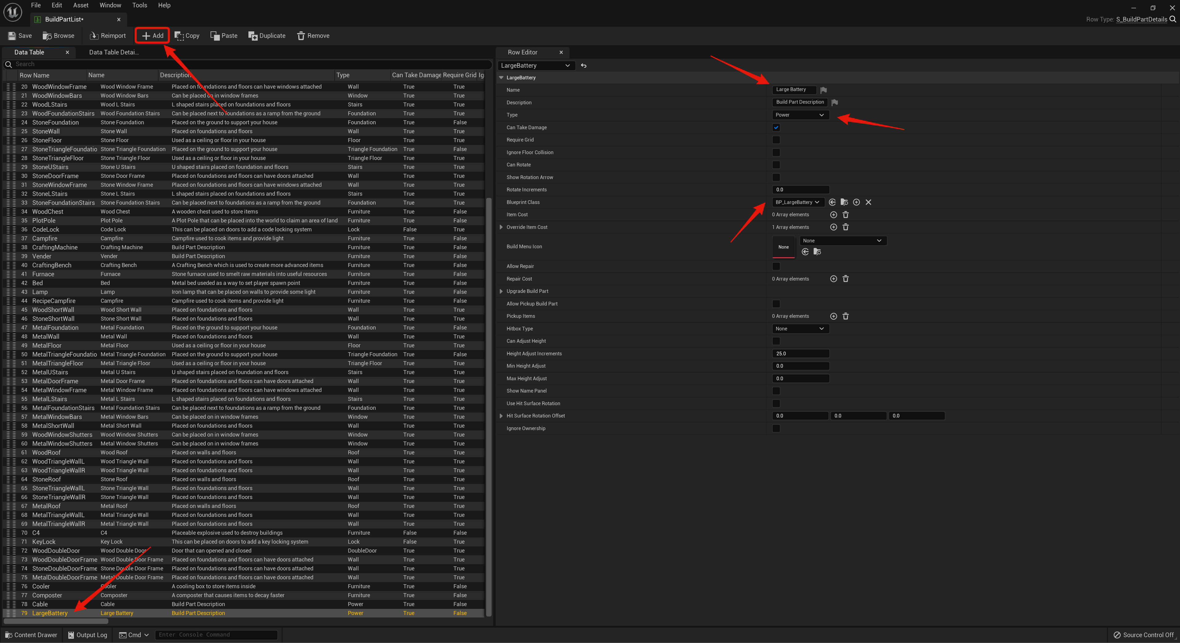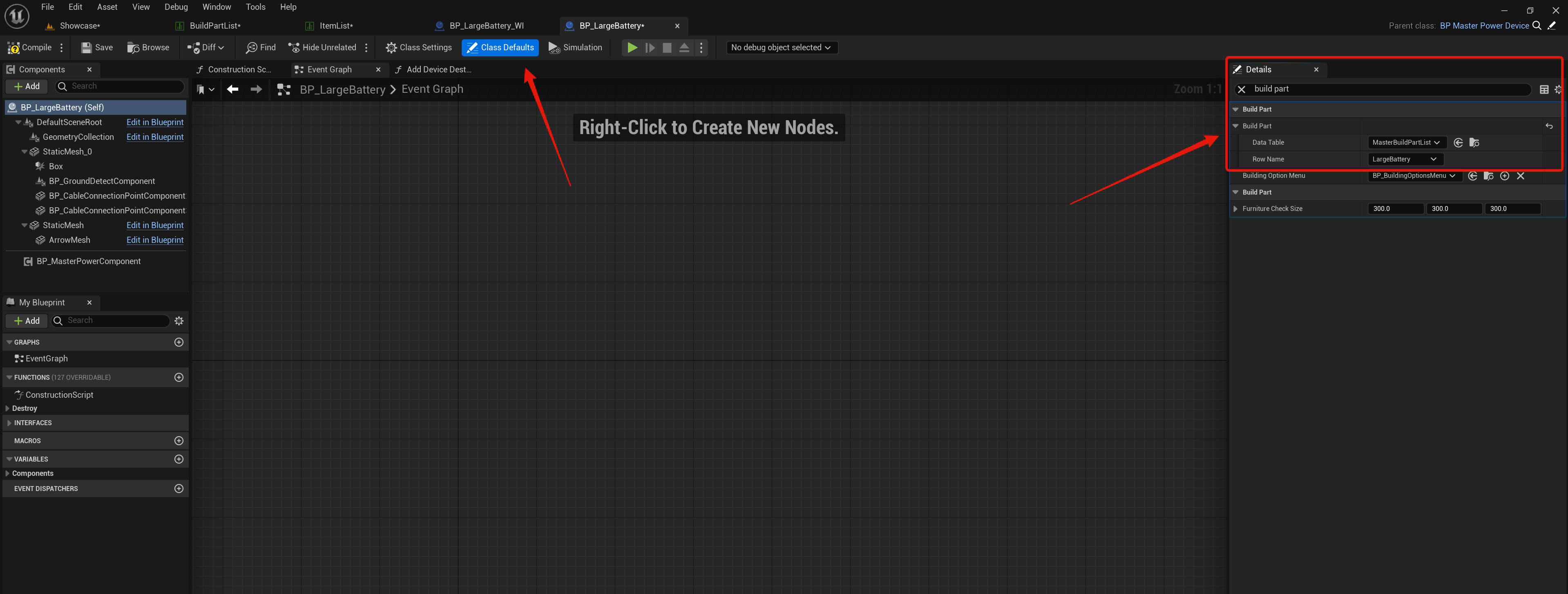 Lastly open the device blueprint in the PlayerElectricitySystem/Blueprints/Devices so for example the BP_LargeBattery then in its Class Defaults search for Build Part then set its Data Table to MasterBuildPartList and set its Row Name to the devices row name from the BuildPartList like the image below.