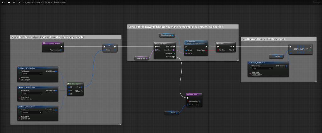 To effect other actions like the water or digup for example you can repeat this process by adding the same code to the SGK Possible Actions and run it from the Completed pin on the ForEachLoop node we added in this guide, just make sure to add the return node to the last Completed pin from the last ForEachLoop you run.