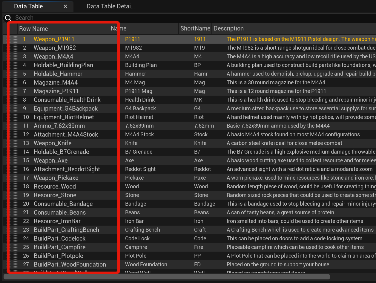 The row name of any item is found in the Item List shown in the image below, you can also add multiple items row names to the array to allow for more then one item to be used. So for example I set mine to Weapon_Axe.
