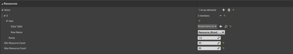 Once you open one of the resource blueprints such as the BP_WoodResource you can find all the resource settings. The first settings are the Resources settings which control the items the player receives when the resource is harvested.