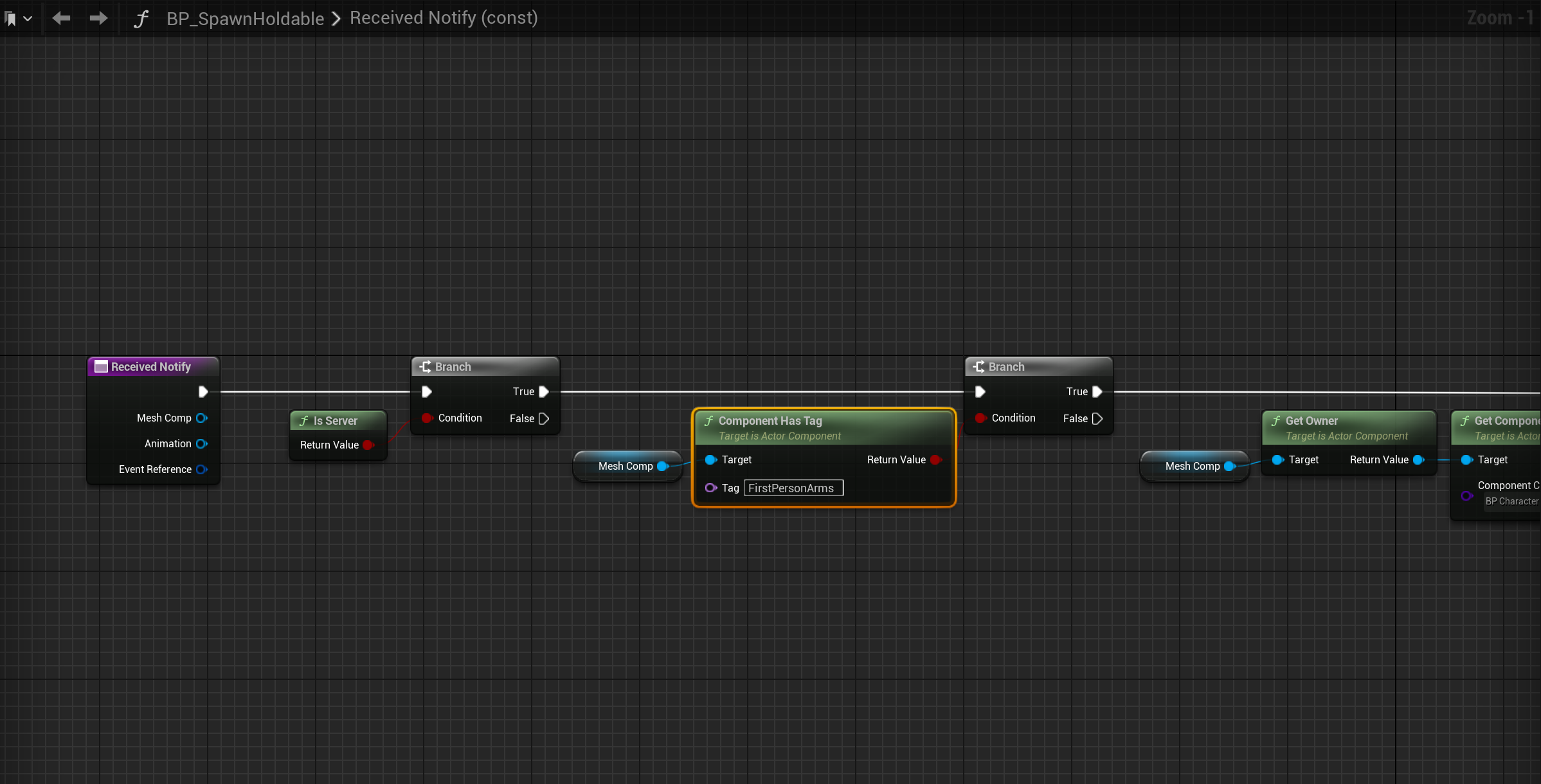 In the Content Browser go to the Animations/Notifes folder and go though each of the blueprints listed below and in thier Received_Notify function change the Tag input on the Component Has Tag node to FirstPersonArms like the example image below.