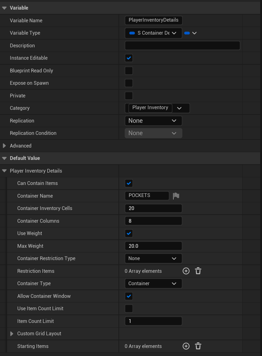 Go to the BP_PlayerInventory and create a new variable called PlayerInventoryDetails and set its Variable Type to S_ContainerDetails and tick on Instance Editable. Then Compile and set its Default Value to the settings shown below.